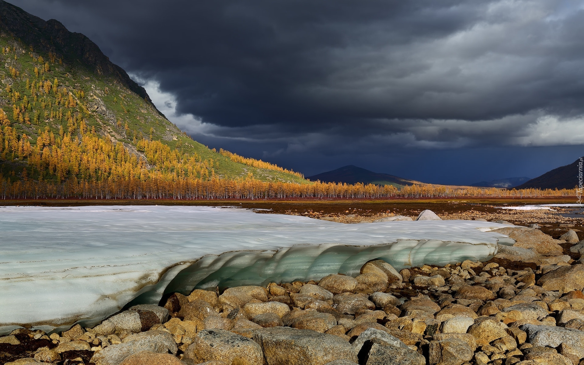 Edytor tapety: Śnieg na kamieniach i góry w oddali