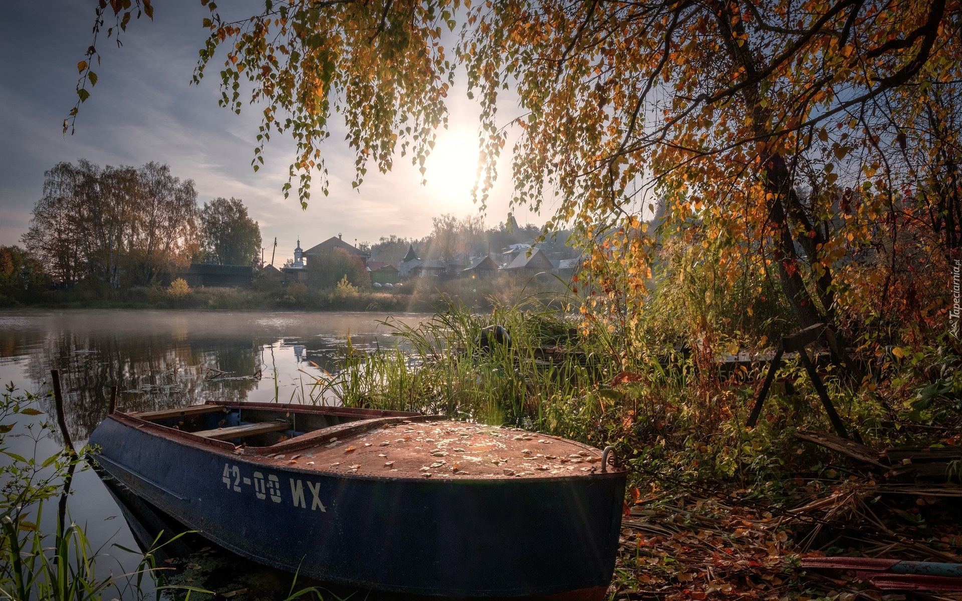 Edytor tapety: Łódka pod brzozami nad rzeką Szochonka