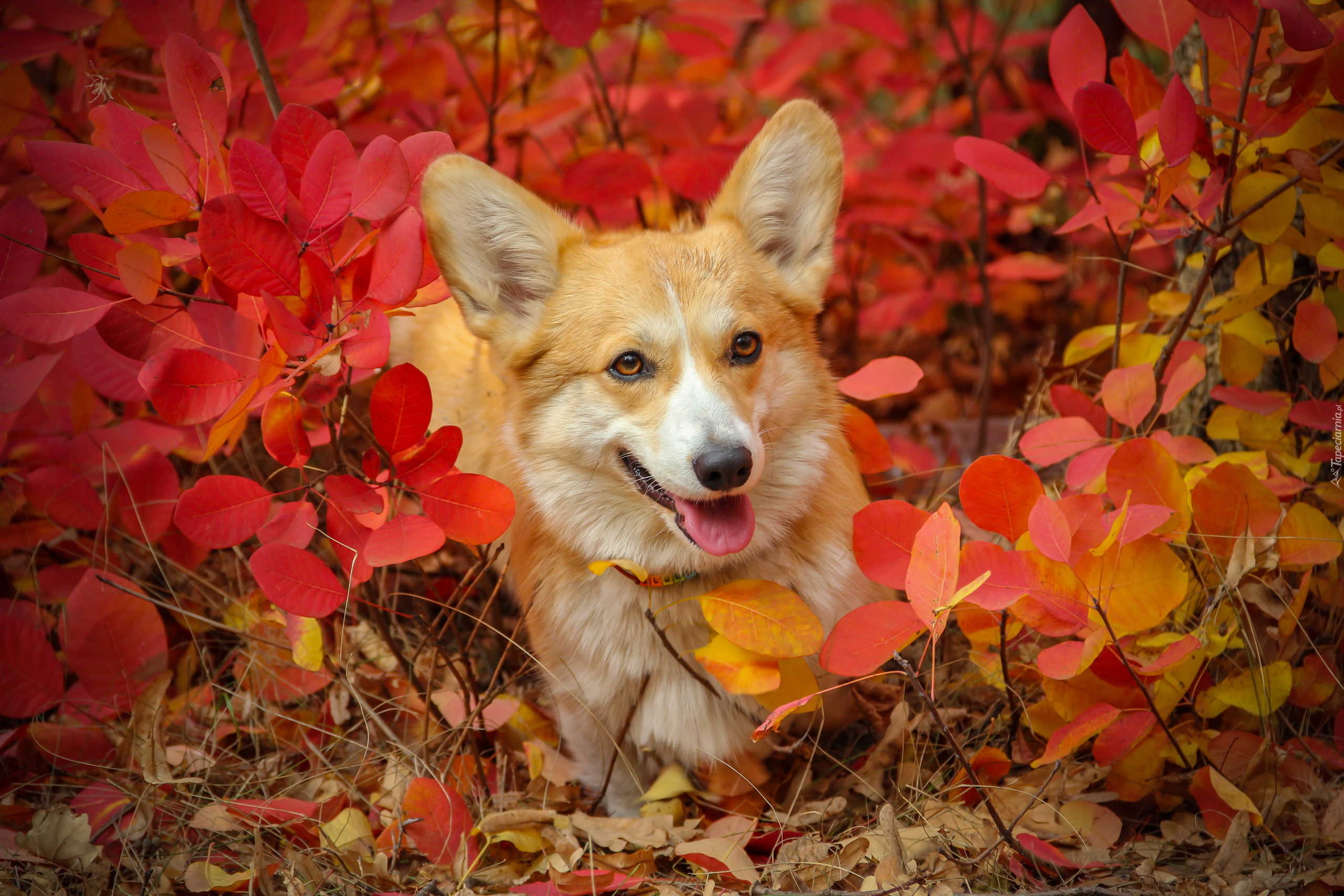 Edytor tapety: Welsh corgi pembroke wśród czerwonych liści