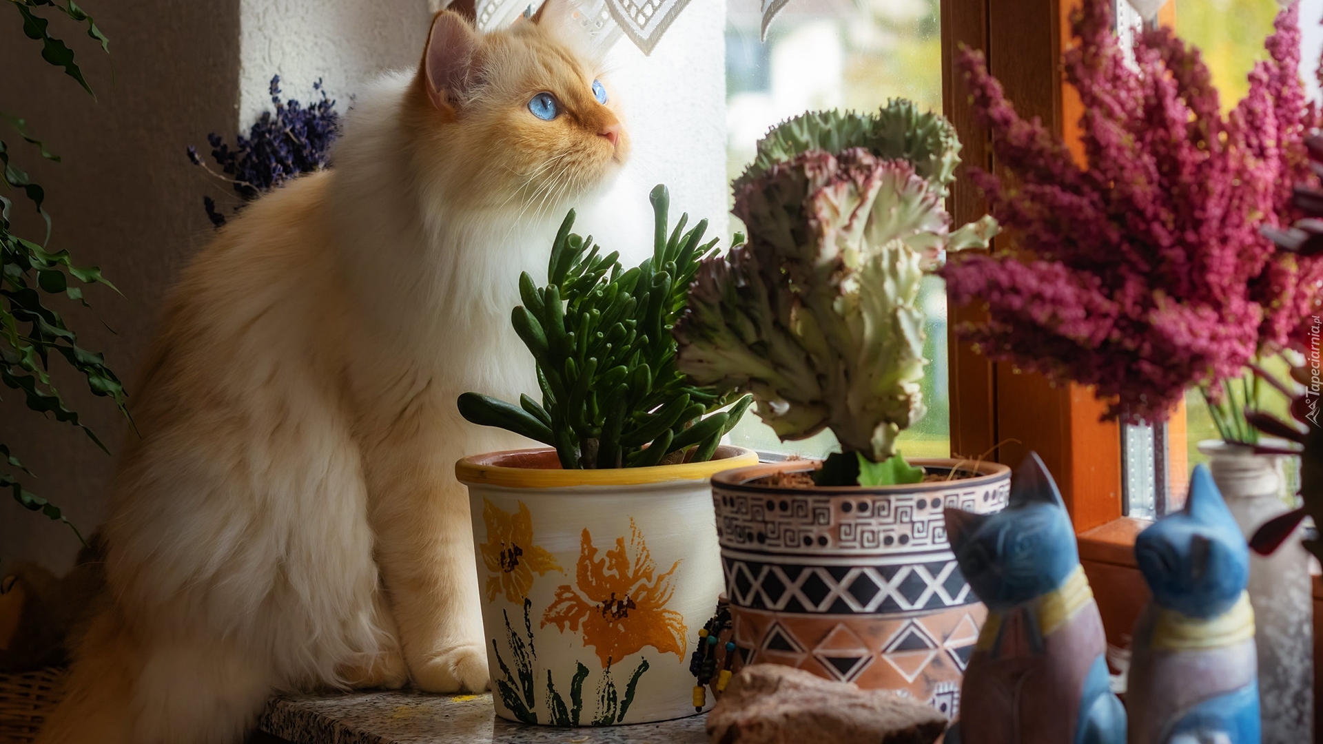 Edytor tapety: Długowłosy niebieskooki kot obok roślin w kolorowych doniczkach