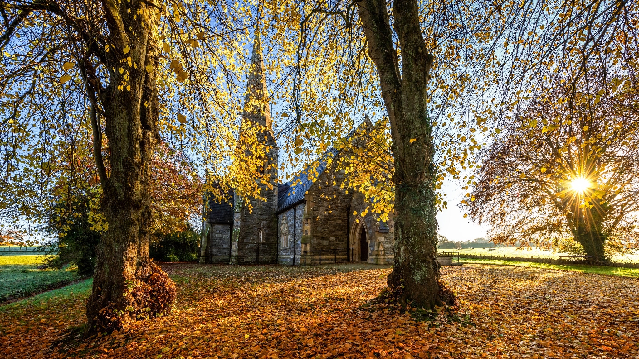 Edytor tapety: Kościół w Strabane pośród jesiennych drzew