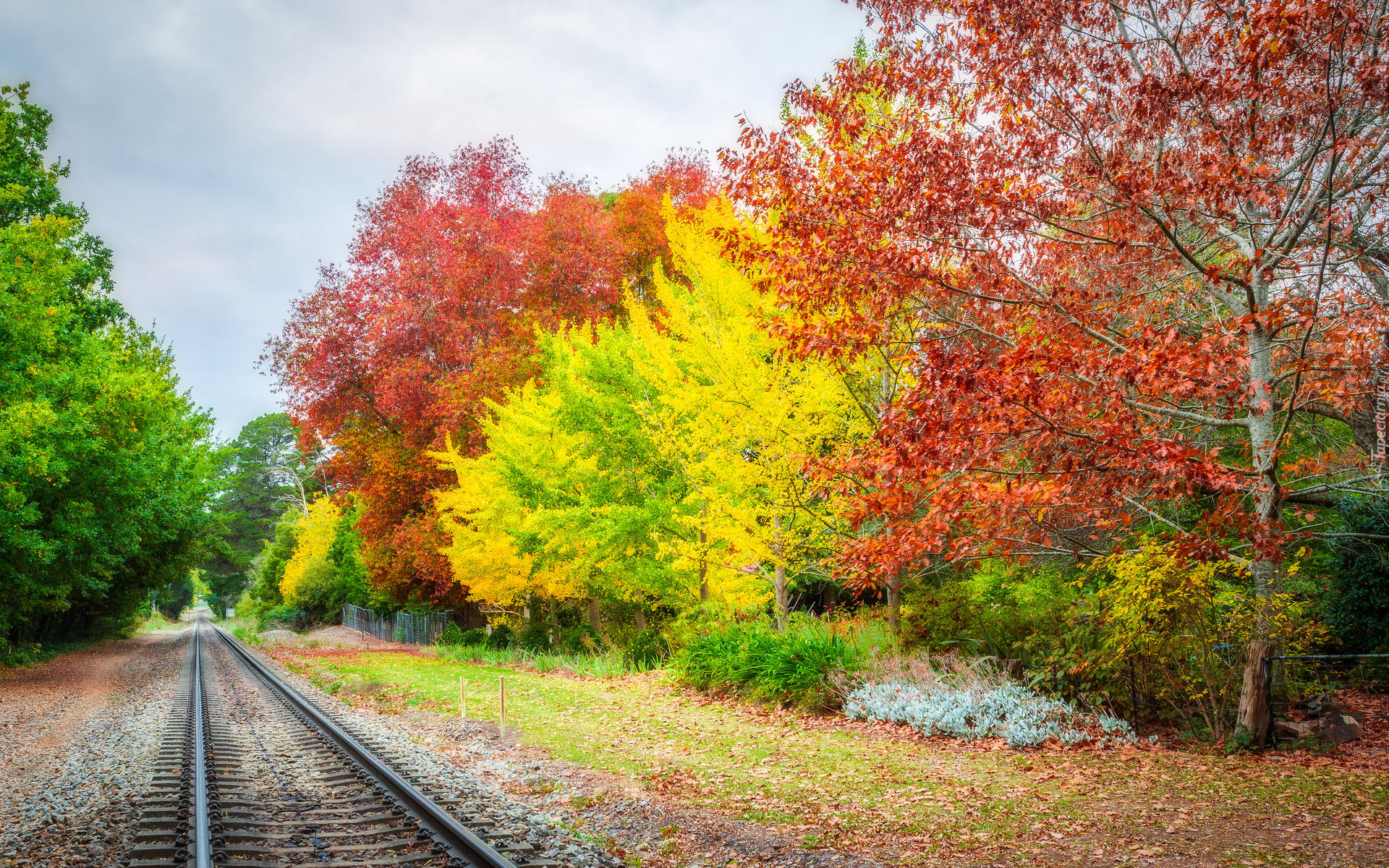 Edytor tapety: Kolorowe drzewa przy torach kolejowych jesienną porą