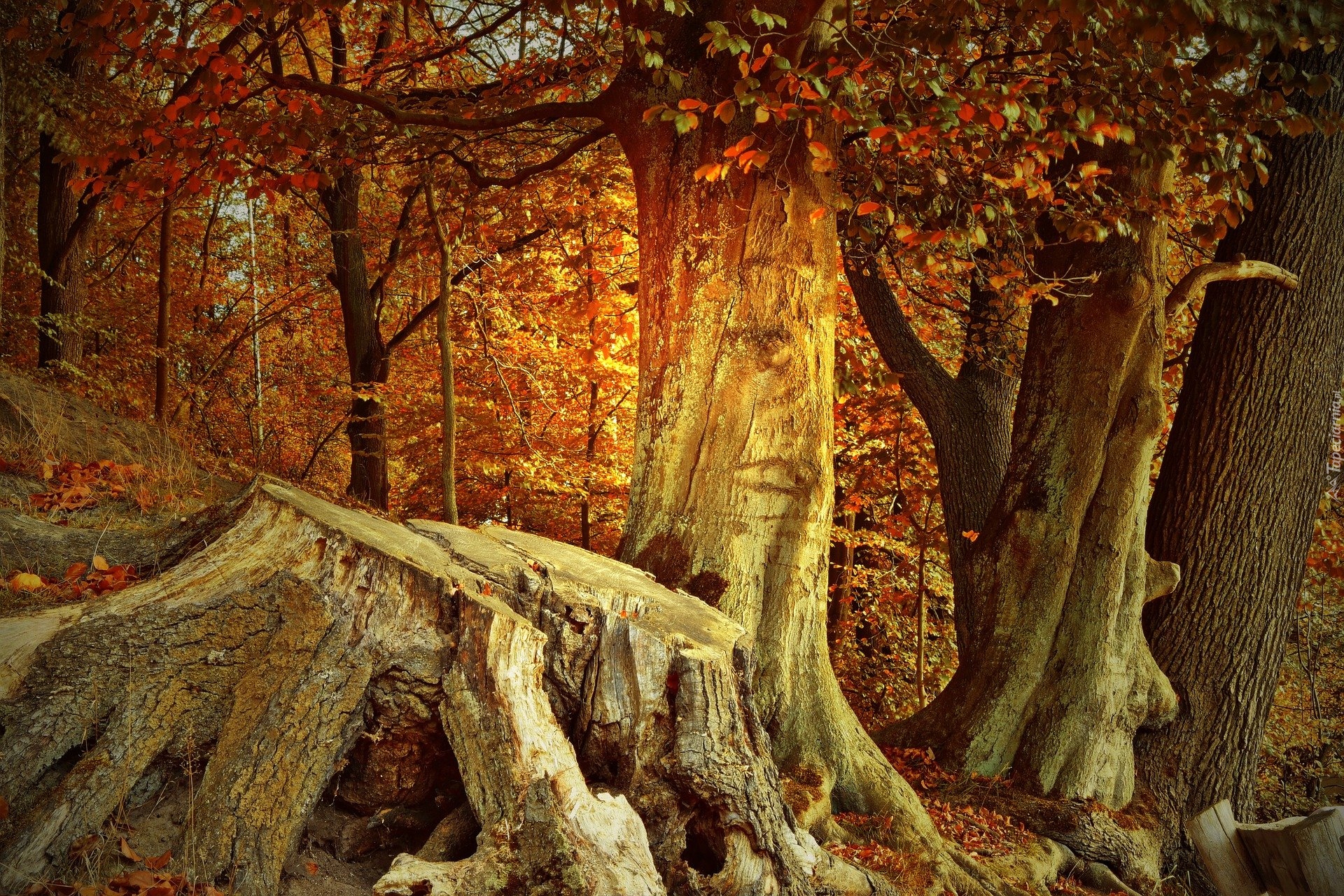 Edytor tapety: Pniak i drzewa w jesiennym lesie