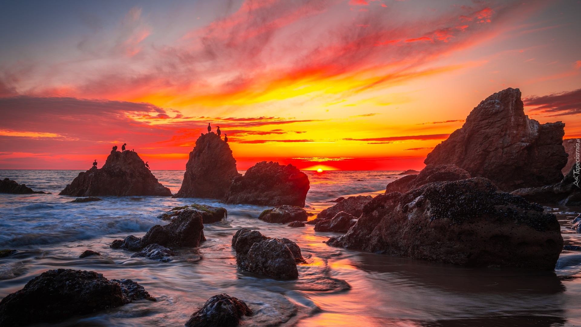Edytor tapety: Ptaki na skałach w morzu o zachodzie słońca