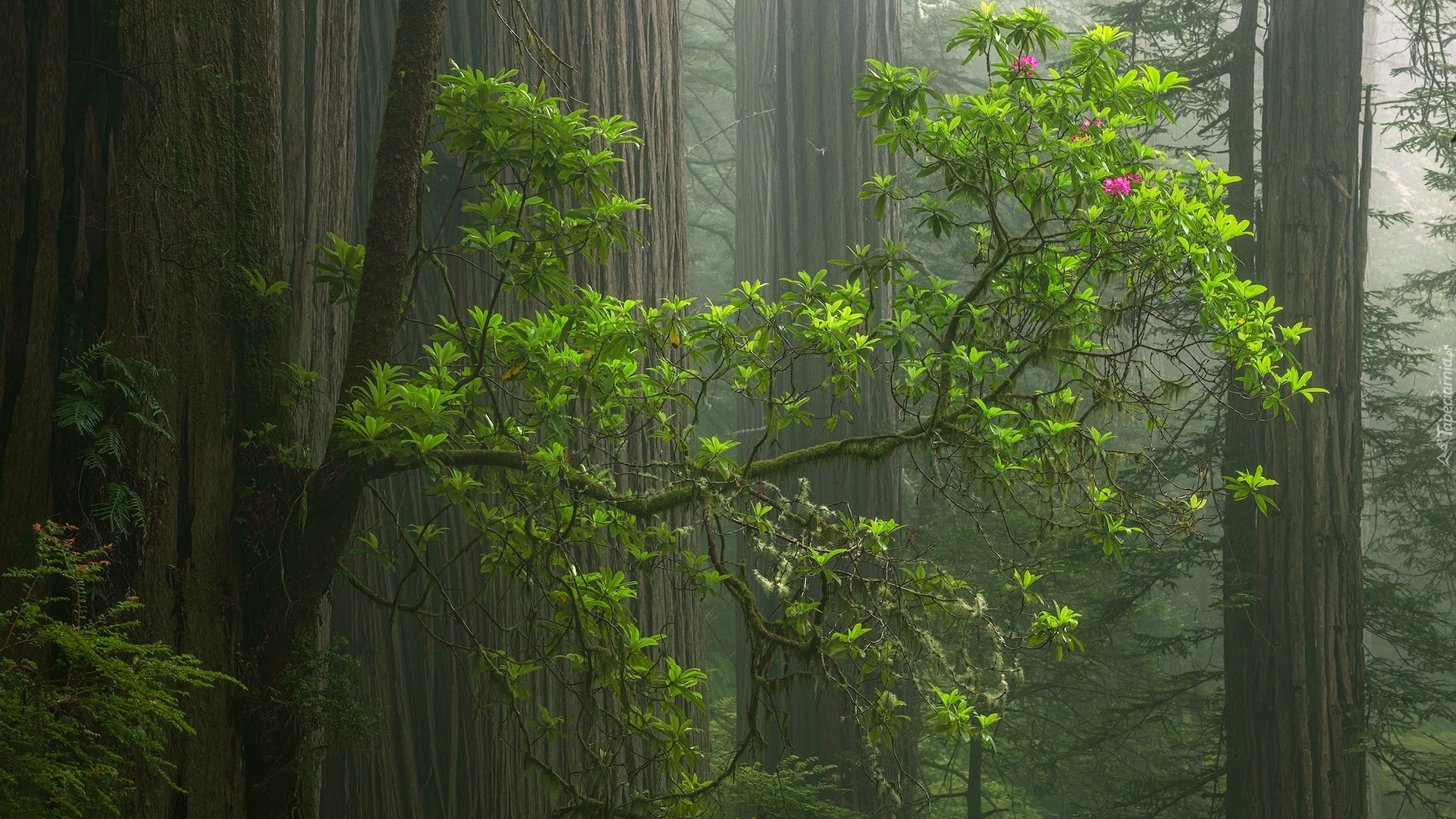 Edytor tapety: Gałęzie różanecznika pośród sekwoi