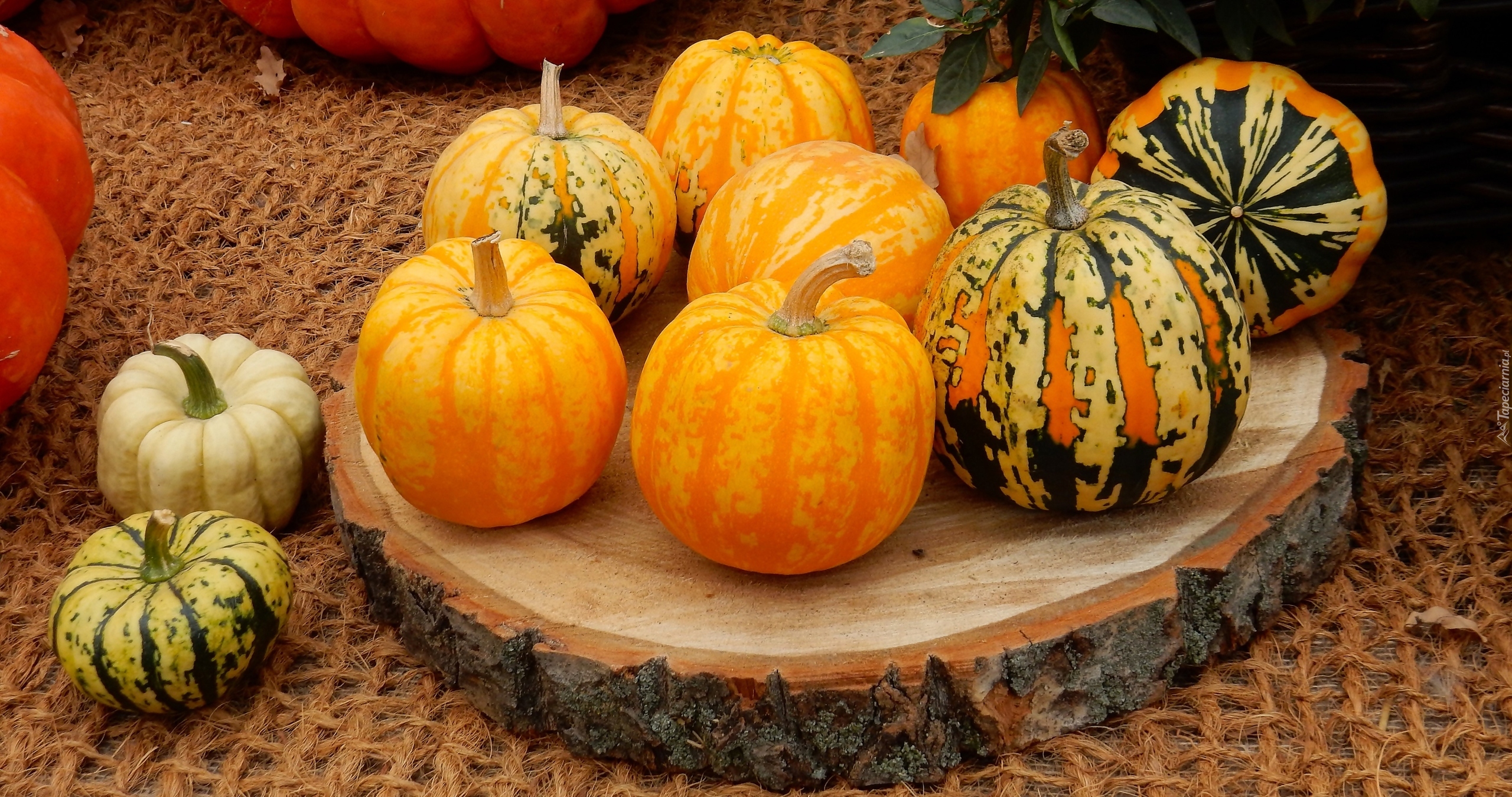 Edytor tapety: Dynie na drewnianym krążku z pnia