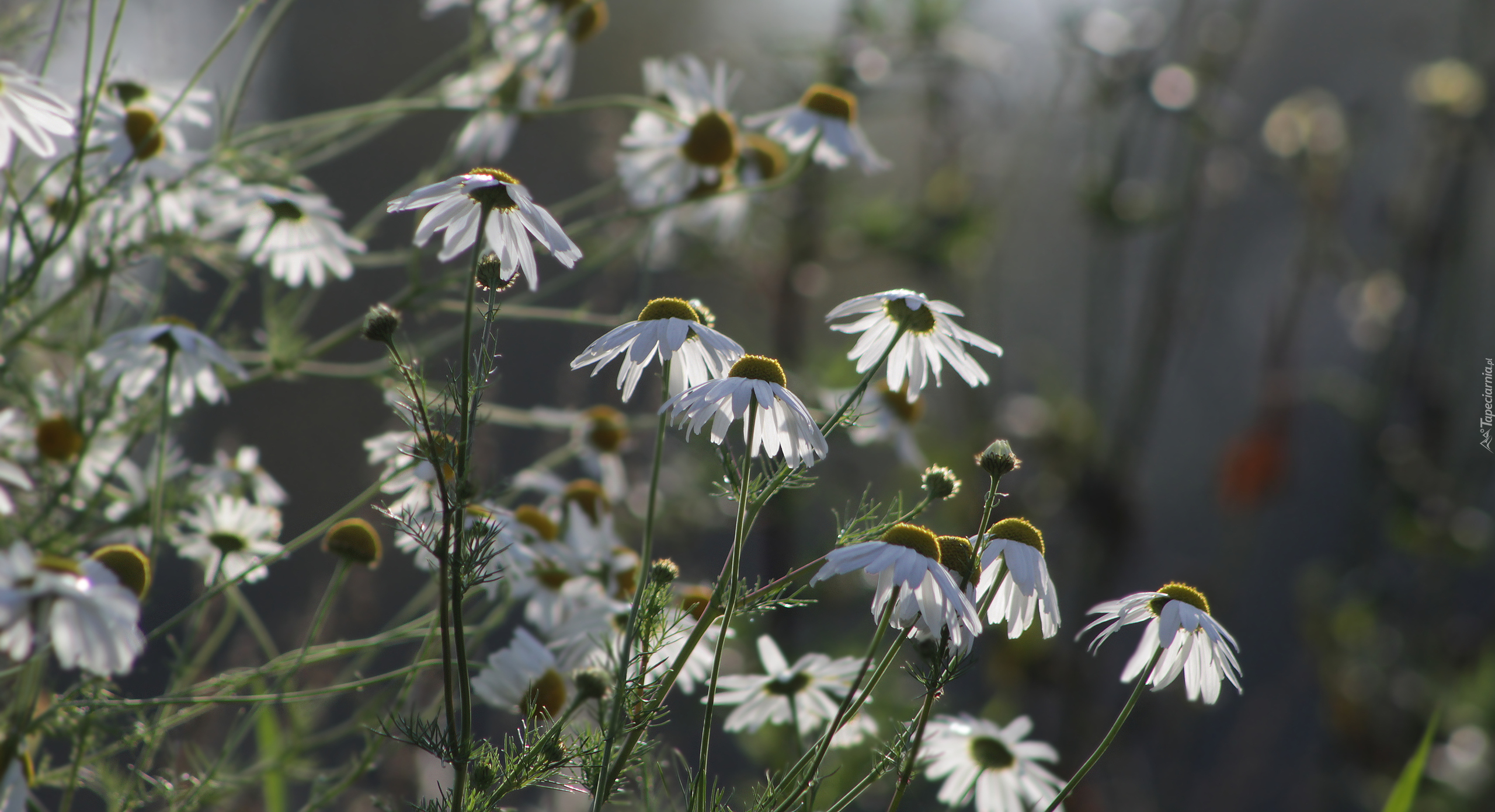 Edytor tapety: Rumianki w zbliżeniu na rozmytym tle