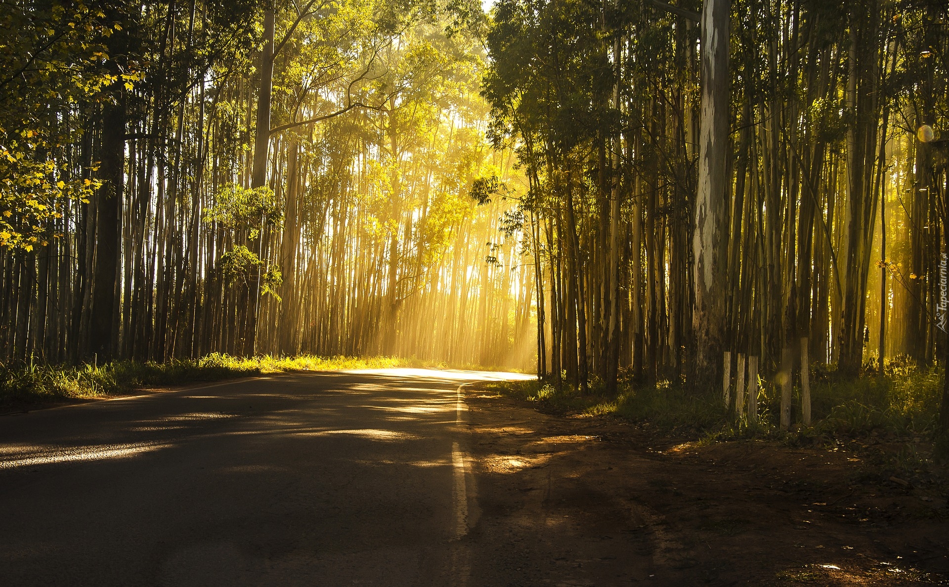 Edytor tapety: Droga pośród drzew w promieniach słońca