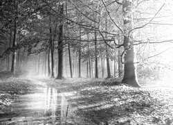 Edytor tapety: Kałuże na leśnej ścieżce w słonecznym blasku