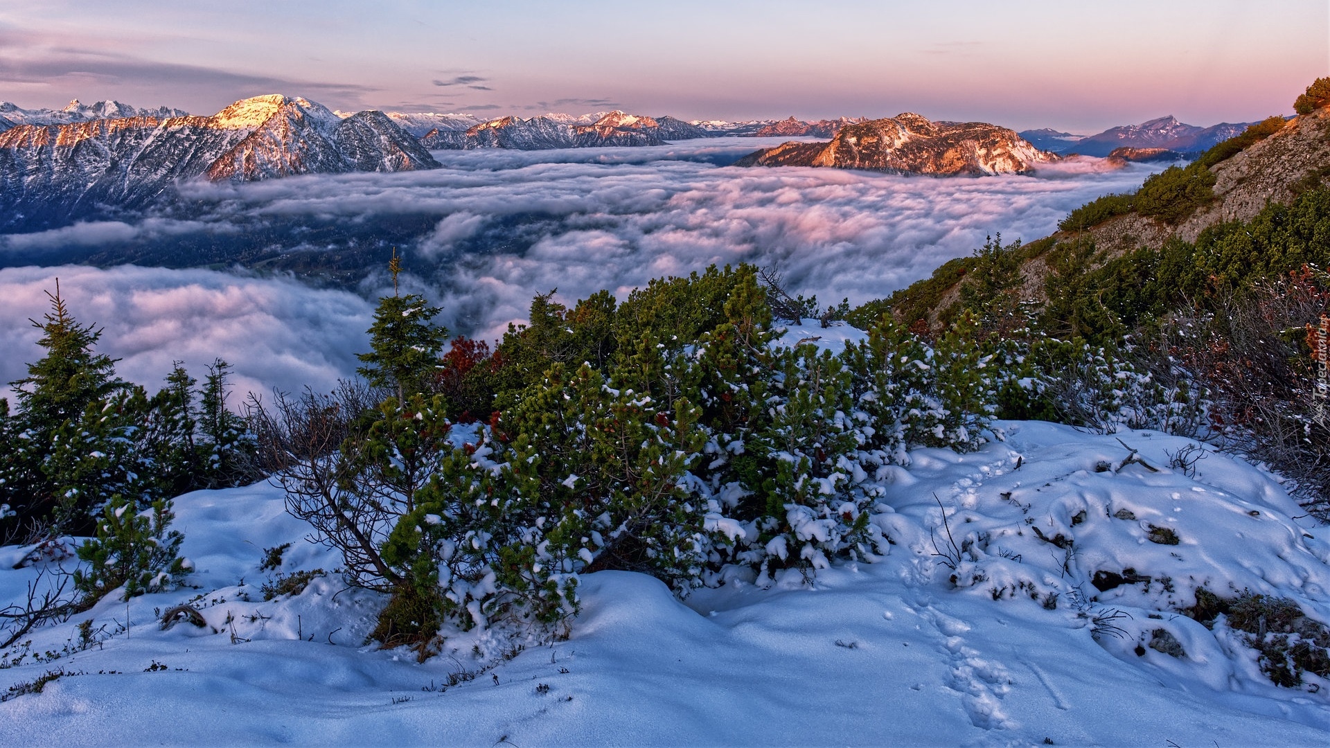 Edytor tapety: Krzewy w śniegu na tle mgły nad górami