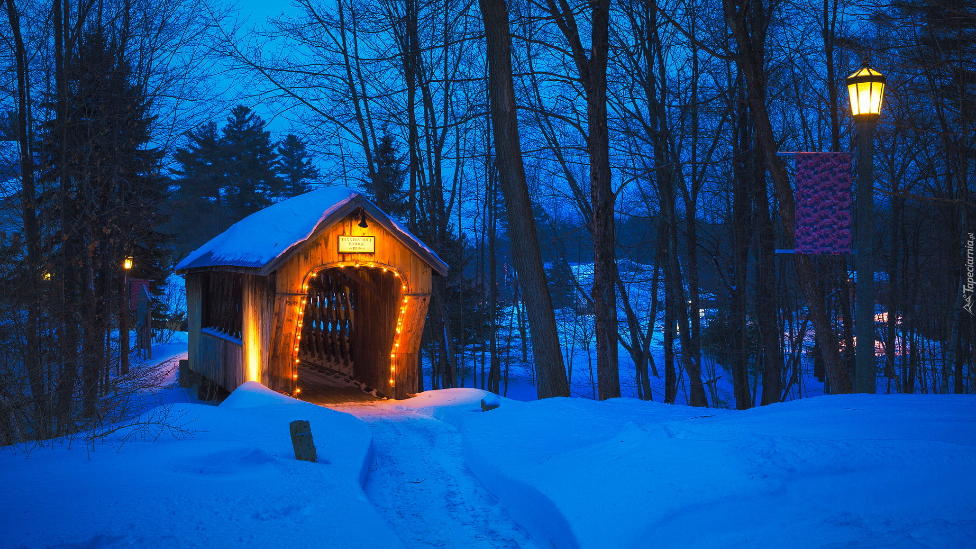 Edytor tapety: Oświetlone zadaszenie nad mostem Tannery Hill Covered Bridge