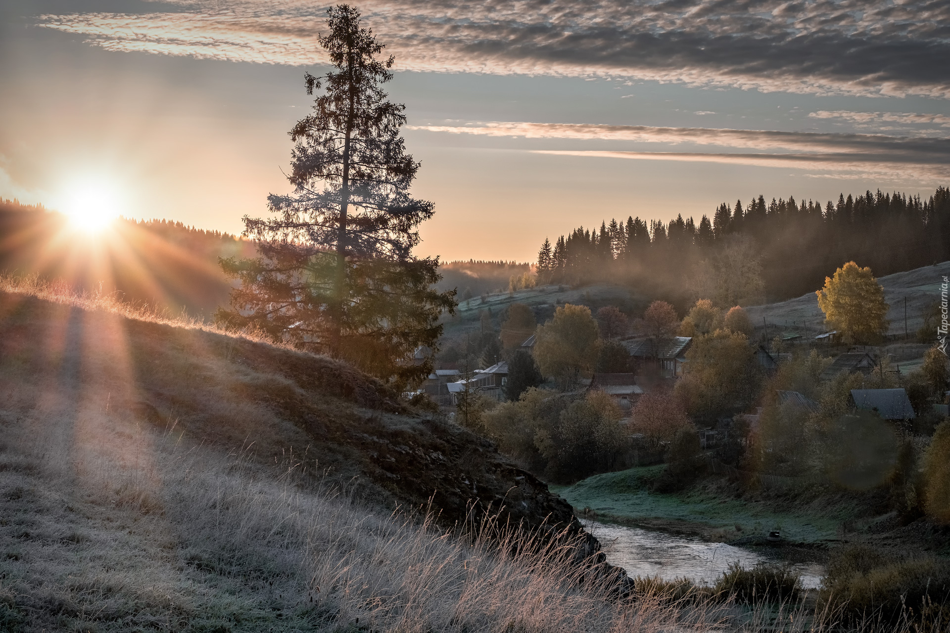 Edytor tapety: Domy i drzewa nad rzeką o poranku
