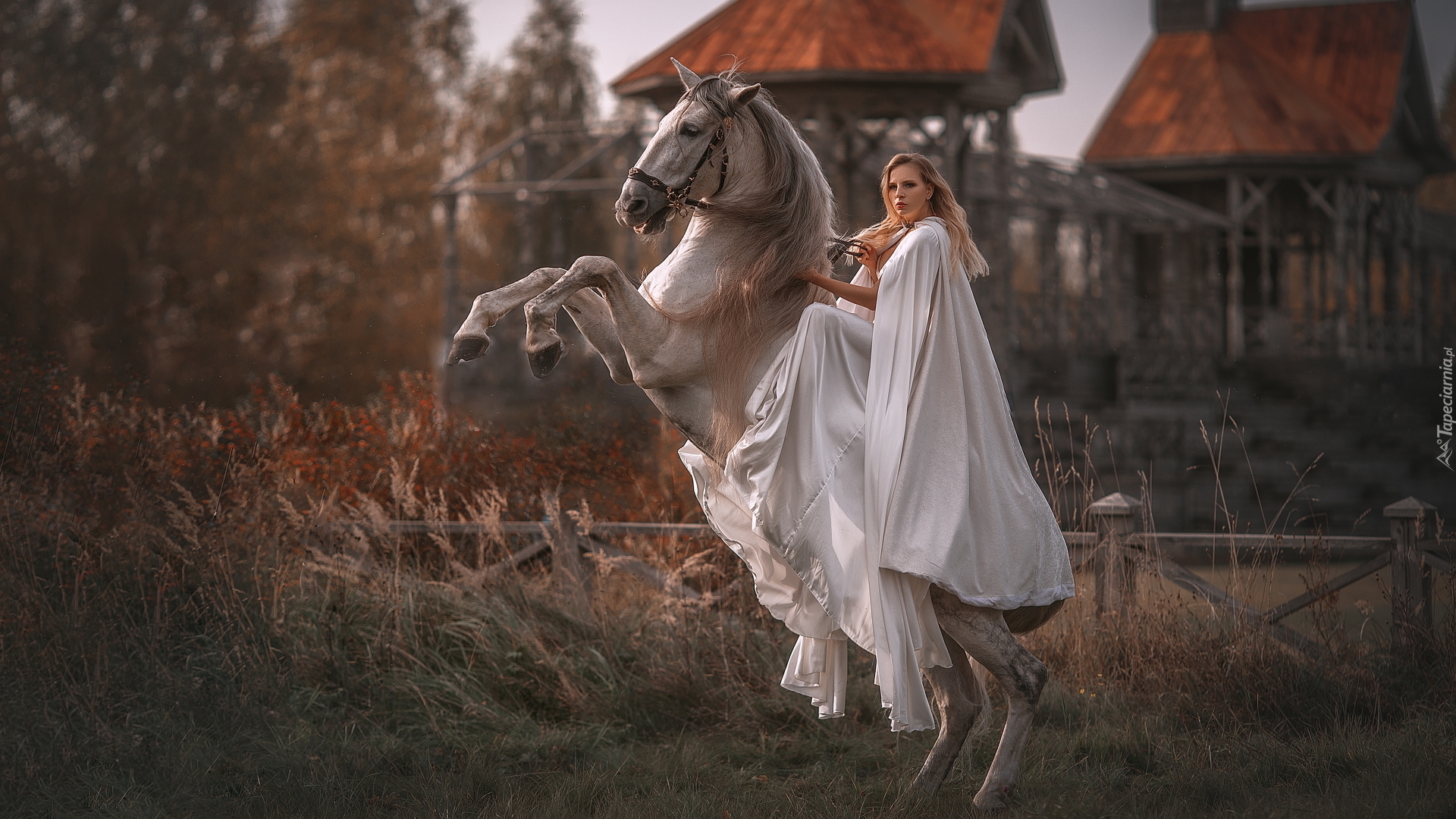 Edytor tapety: Kobieta w białej pelerynie na siwym koniu