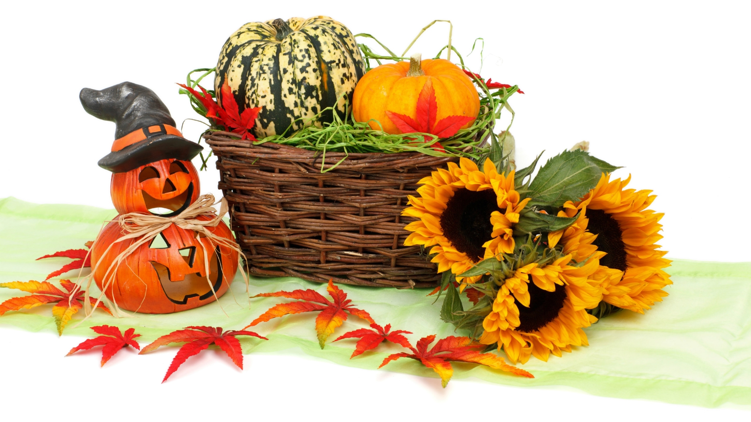 Edytor tapety: Dynie w koszyku obok lampionu i słoneczników