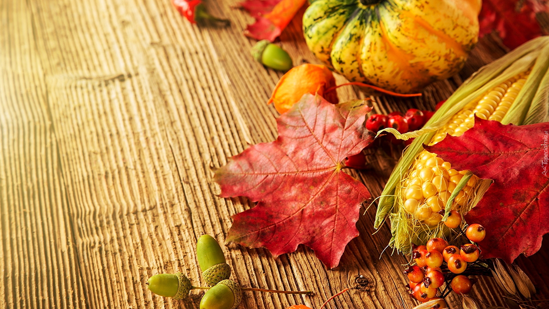 Edytor tapety: Kolba kukurydzy i jesienne liście w kompozycji