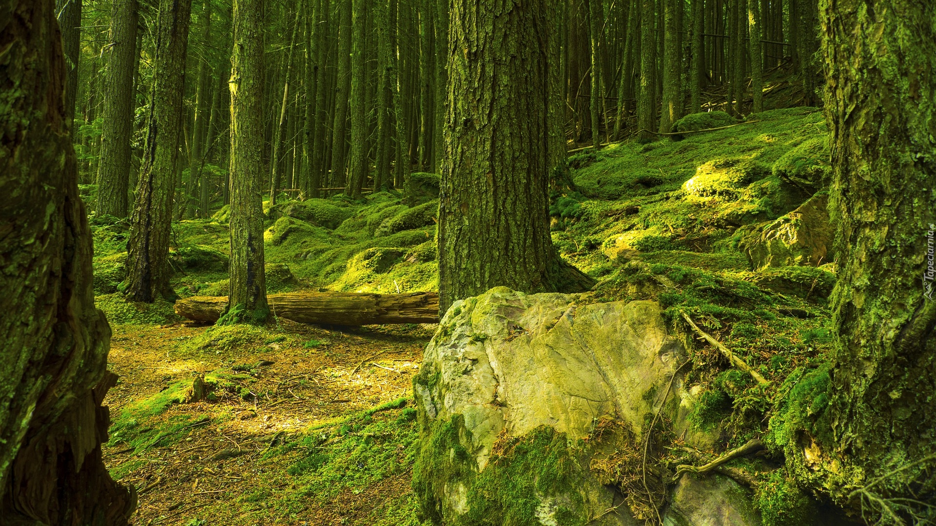 Edytor tapety: Omszałe kamienie i drzewa w lesie