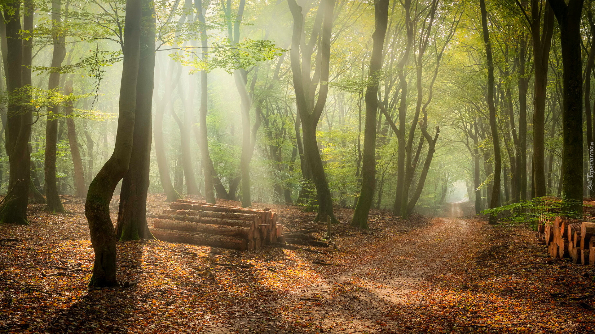 Edytor tapety: Kłody drzew przy ścieżce w zielonym lesie