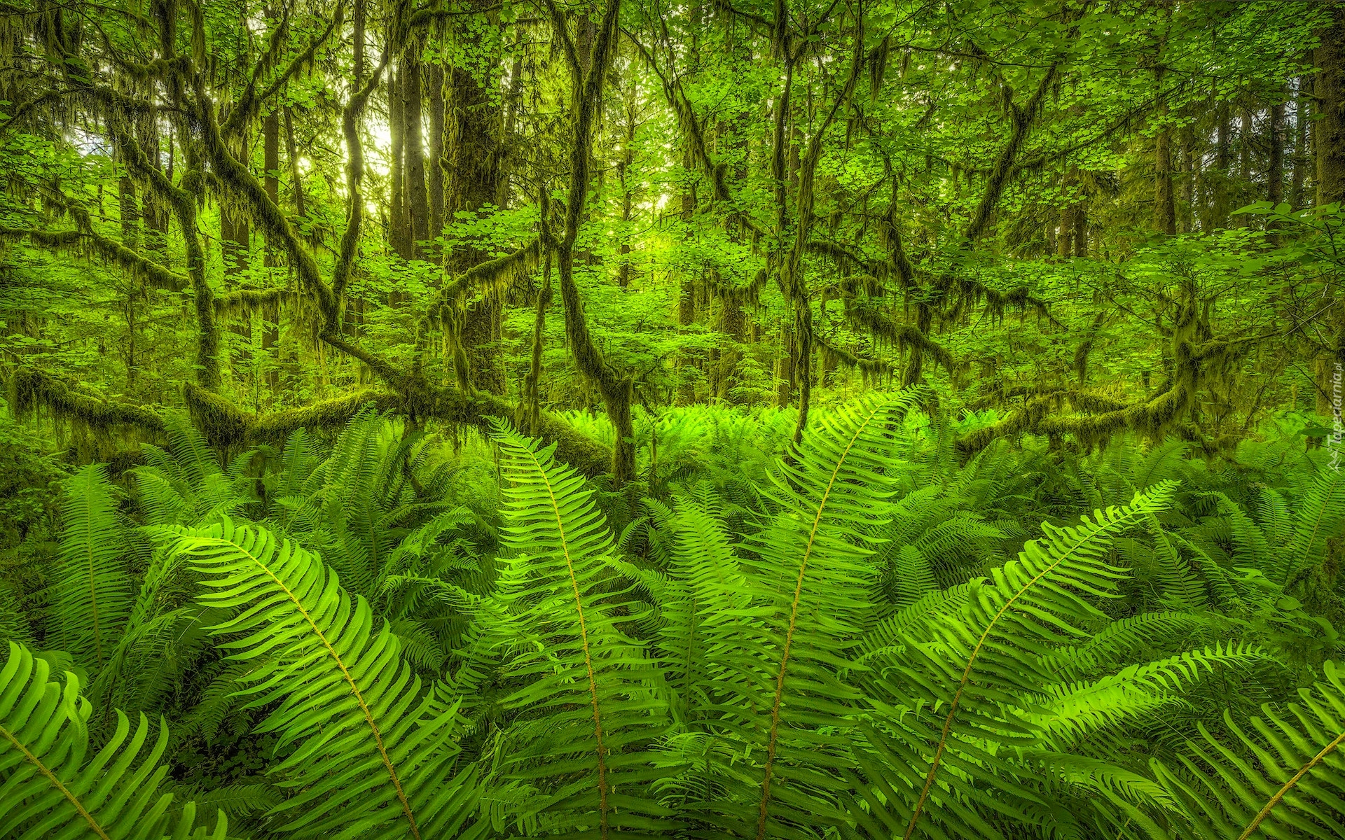 Edytor tapety: Paprocie pod gałęziami drzew okrytymi mchem hiszpańskim