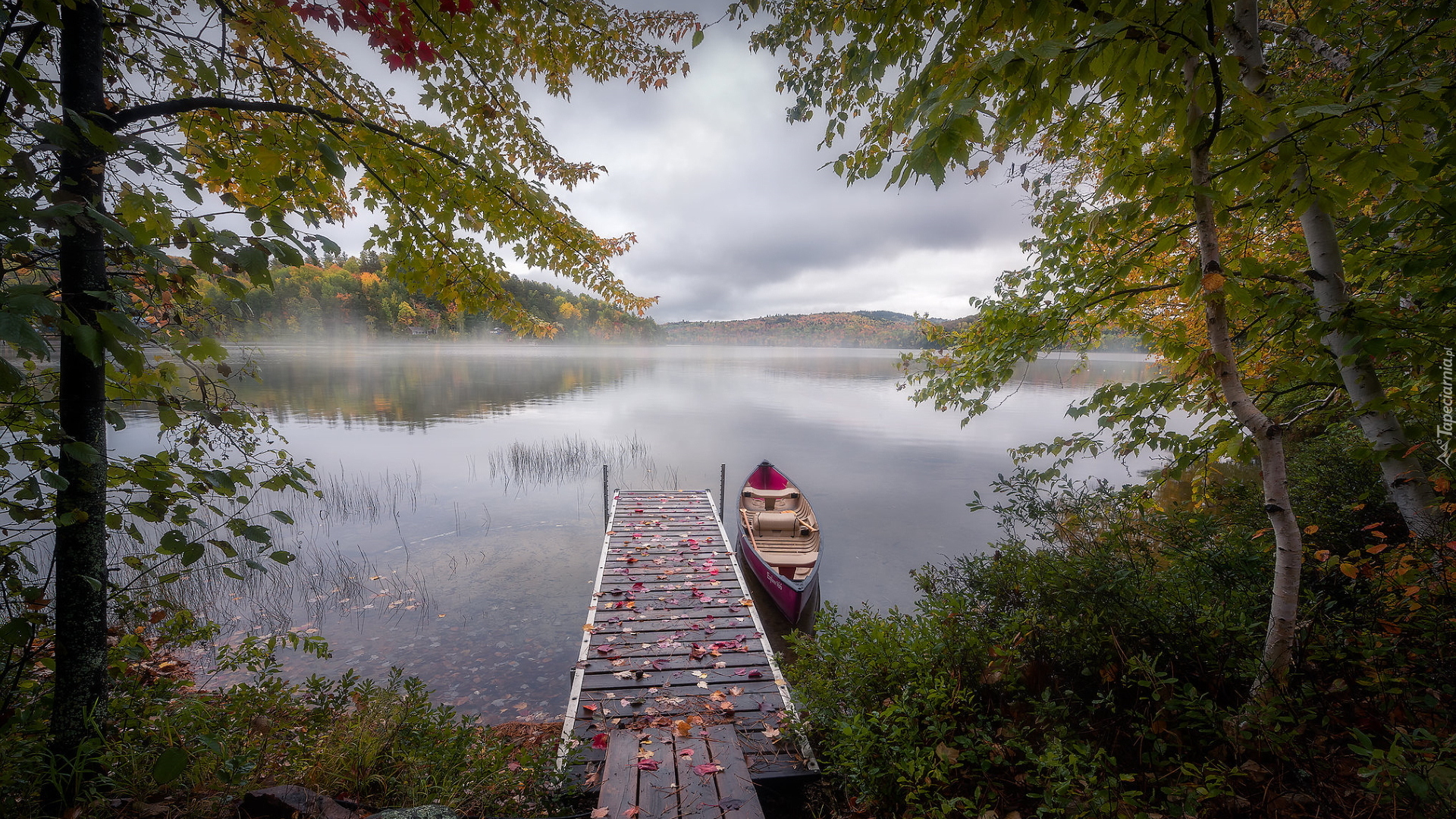 Edytor tapety: Kajak przy pomoście na jeziorze pośród drzew