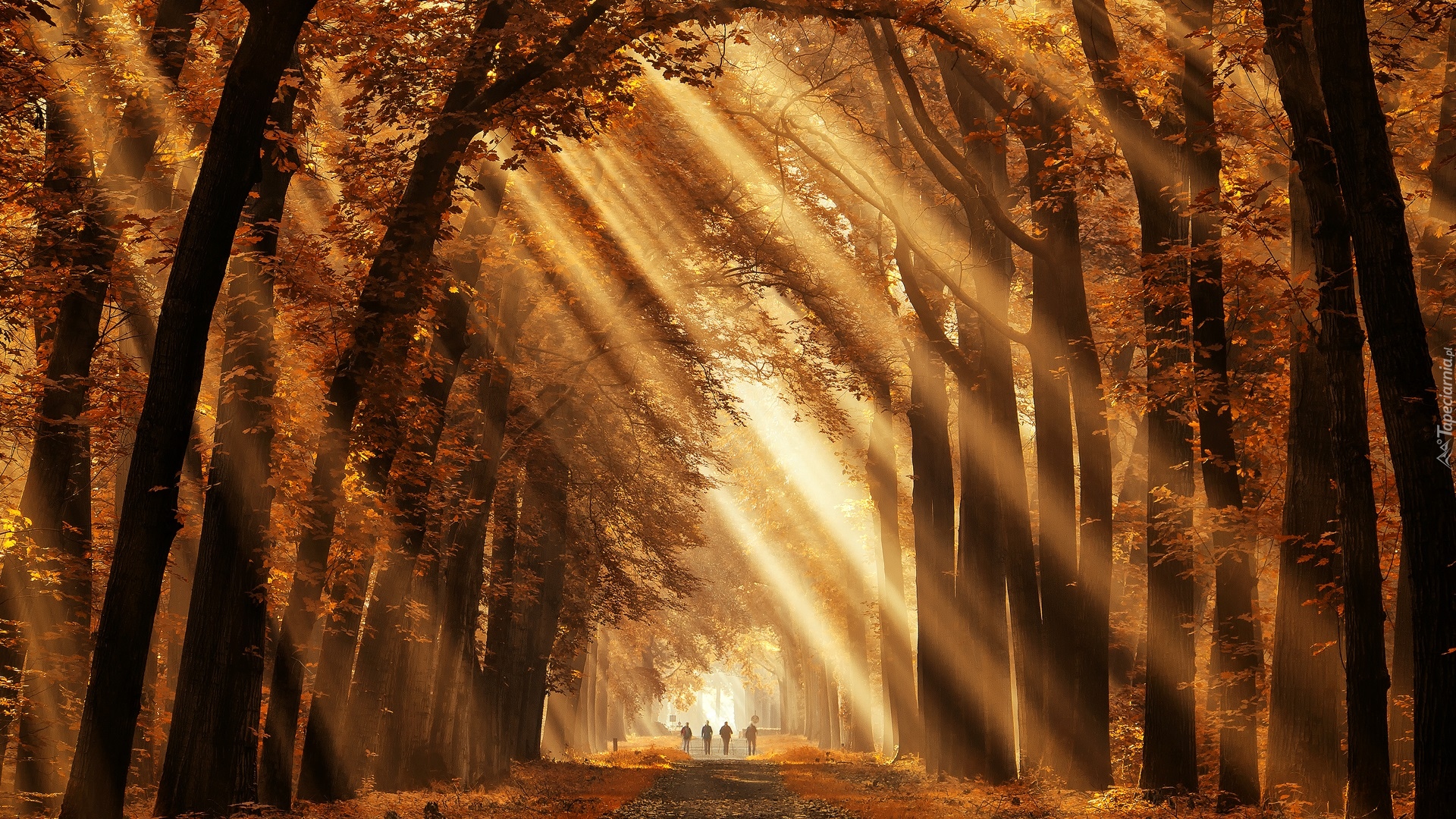 Edytor tapety: Drzewa nad drogą w słonecznym świetle