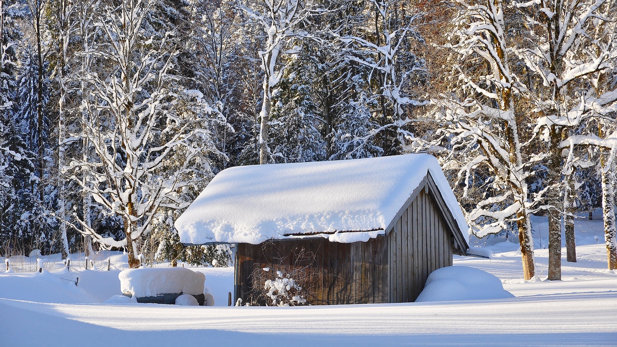 Edytor tapety: Ośnieżona szopa pod drzewami