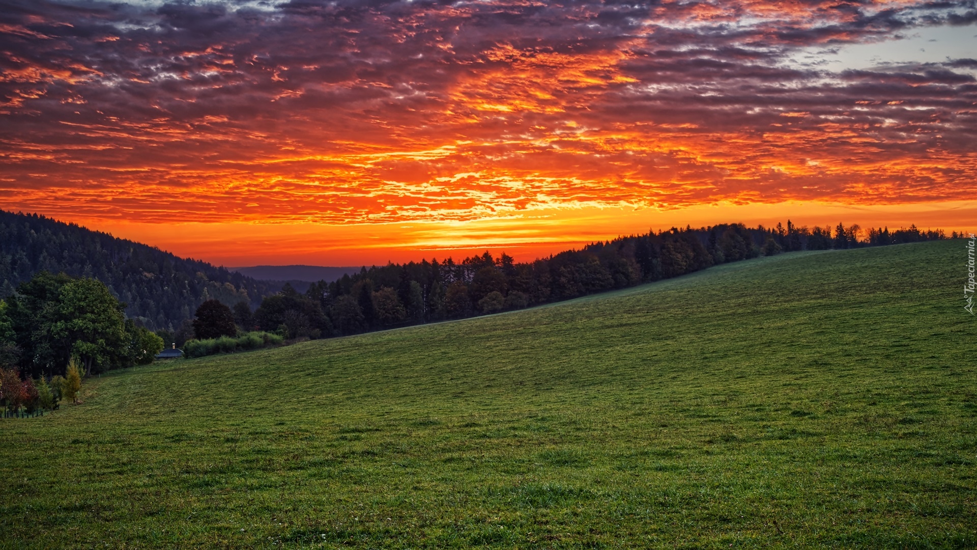 Edytor tapety: Kolorowy zachód słońca nad zalesionymi wzgórzami