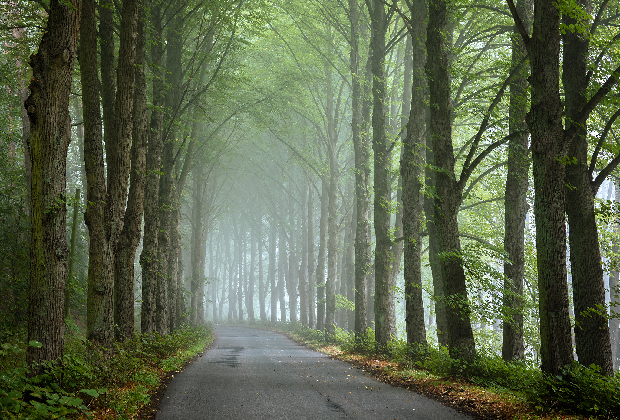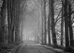 Edytor tapety: Zamglona droga pośród wysokich drzew