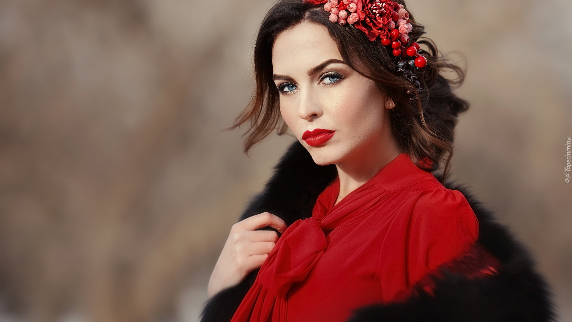 Edytor tapety: Kobieta w czerwonej bluzce z kwiatami we włosach