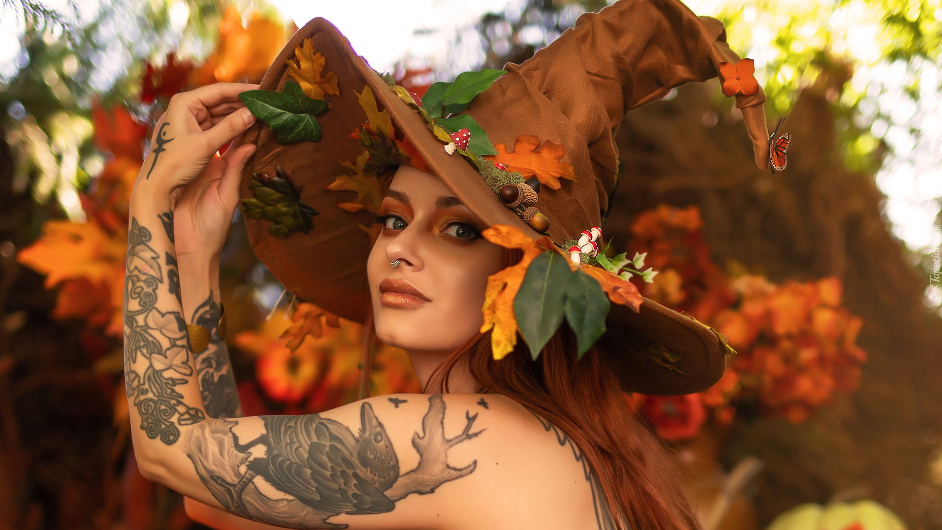 Edytor tapety: Kobieta z tatuażem w kapeluszu czarownicy