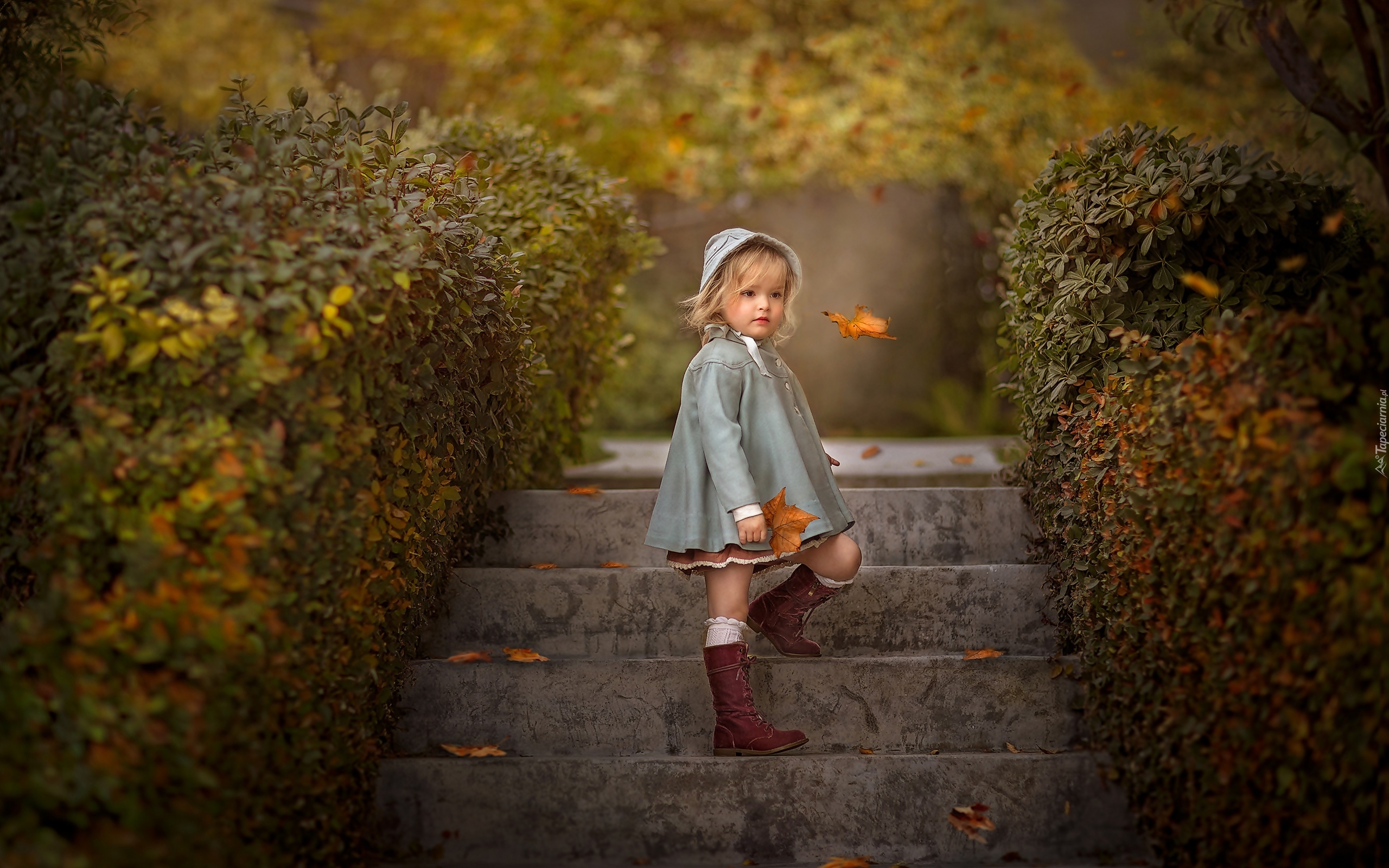 Edytor tapety: Dziewczynka na schodach przy żywopłocie