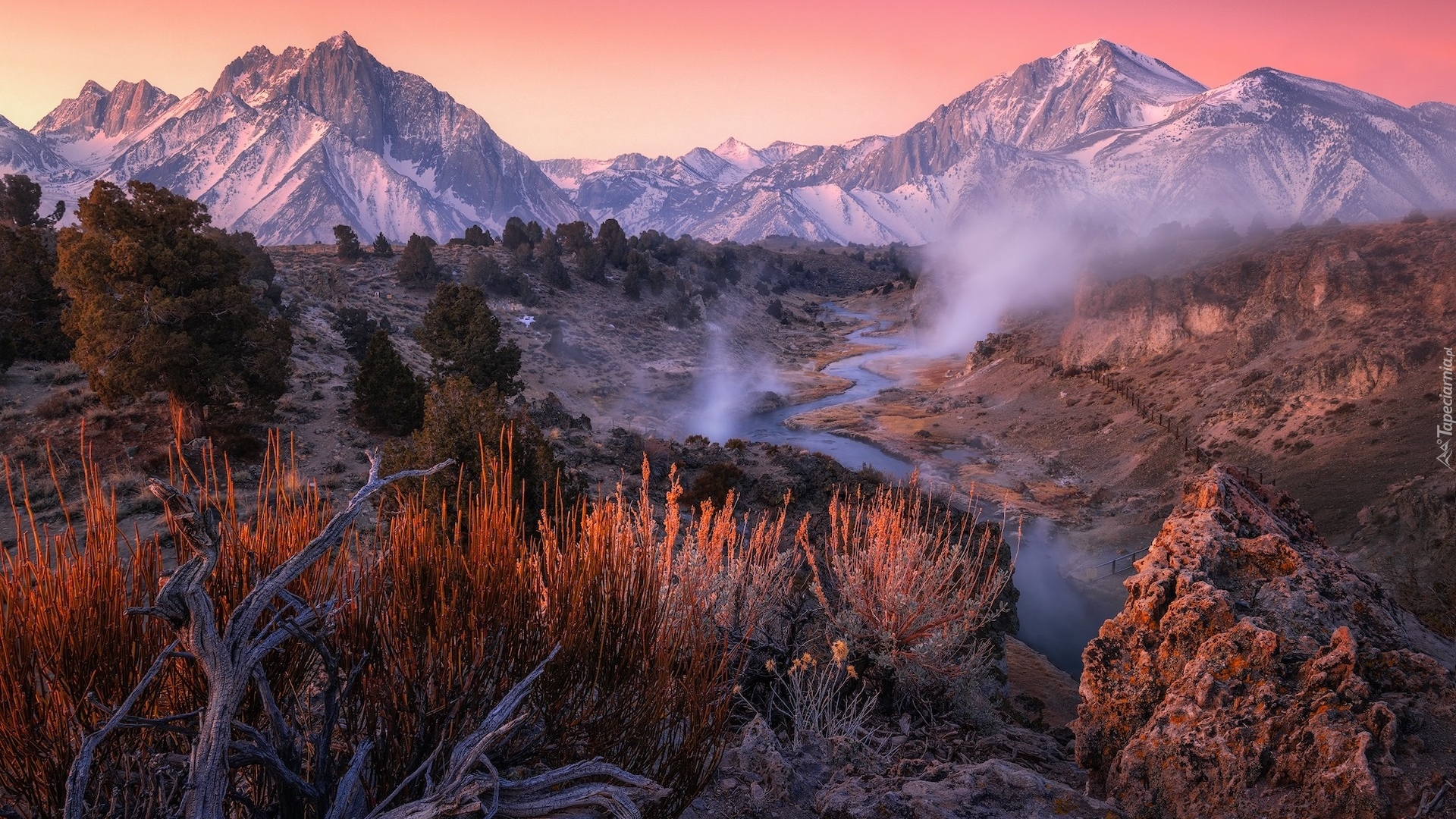 Edytor tapety: Widok ze skał na rzekę i ośnieżone góry