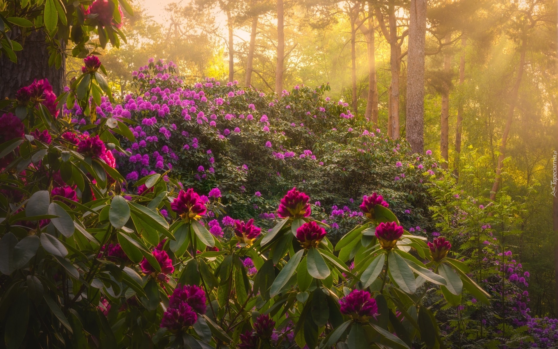 Edytor tapety: Kwitnące krzewy różanecznika w oświetlonym słońcem lesie