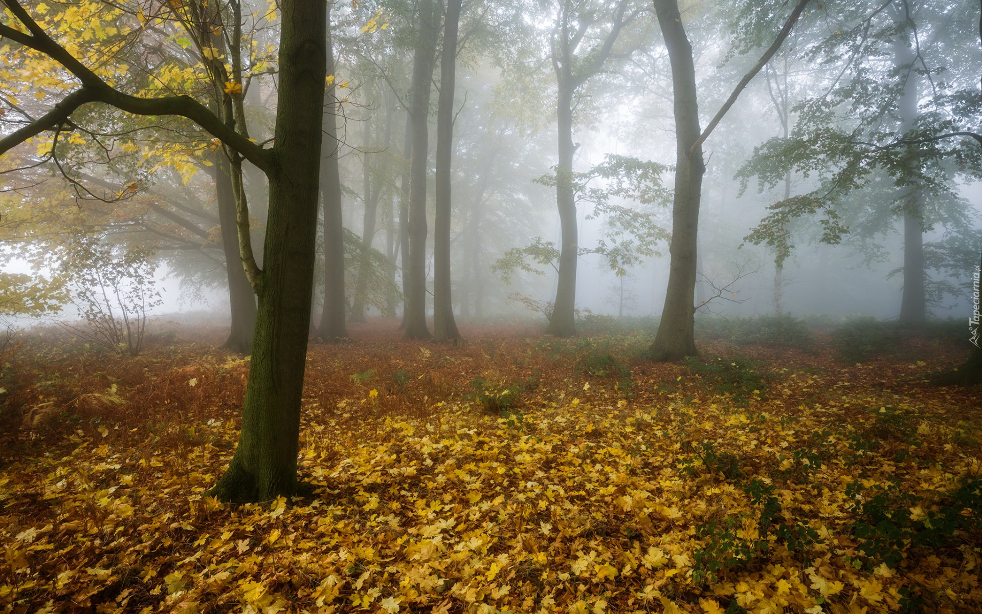 Edytor tapety: Opadłe liście w jesiennym zamglonym lesie