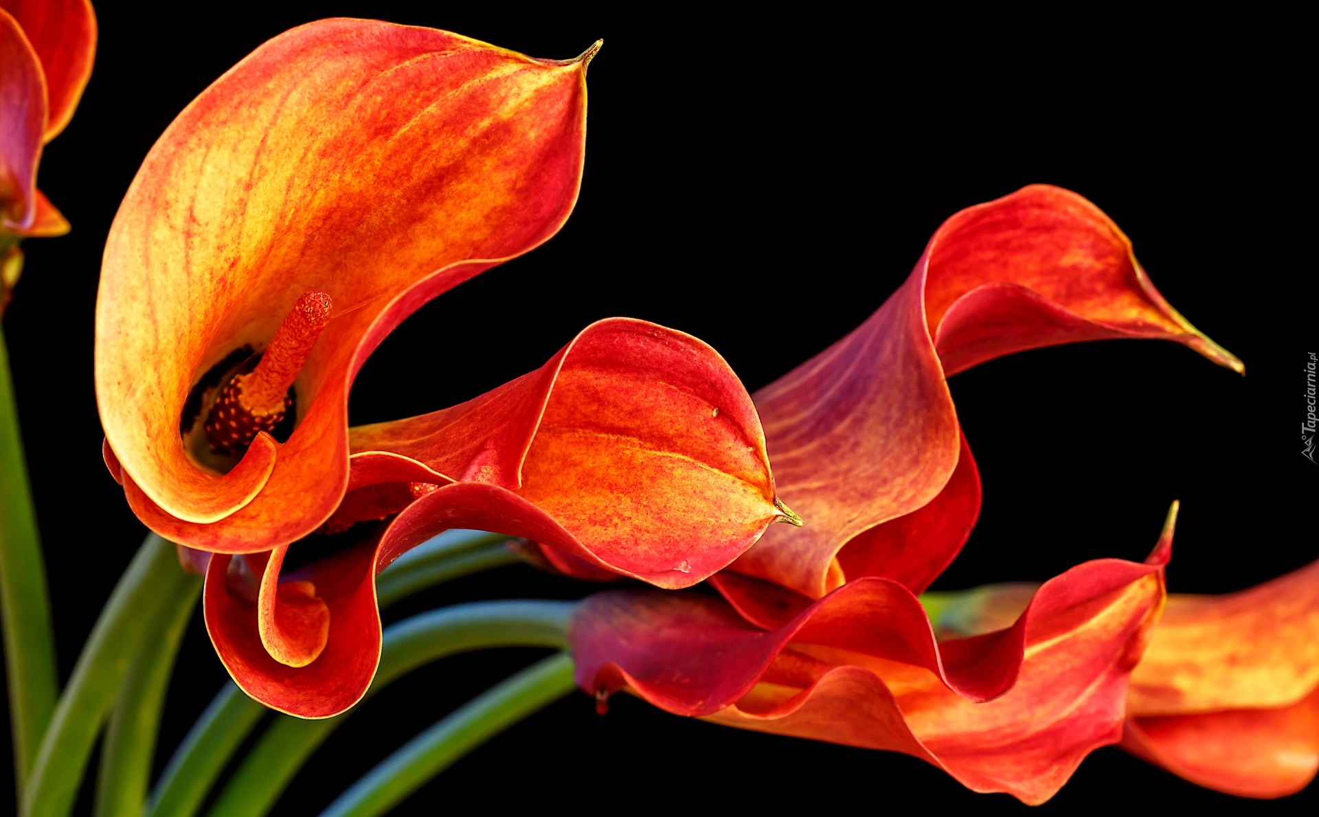Edytor tapety: Pomarańczowe kalie na ciemnym tle