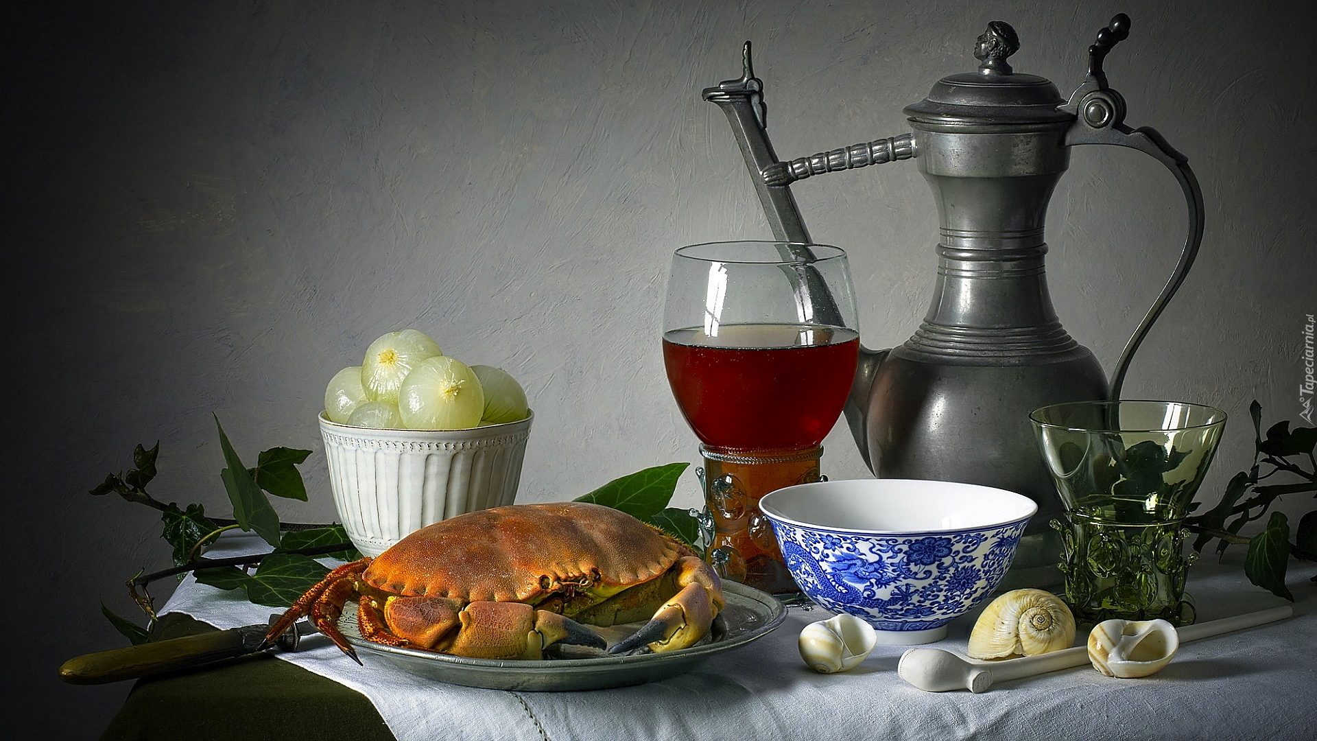 Edytor tapety: Krab na talerzu obok dzbanka i kieliszka