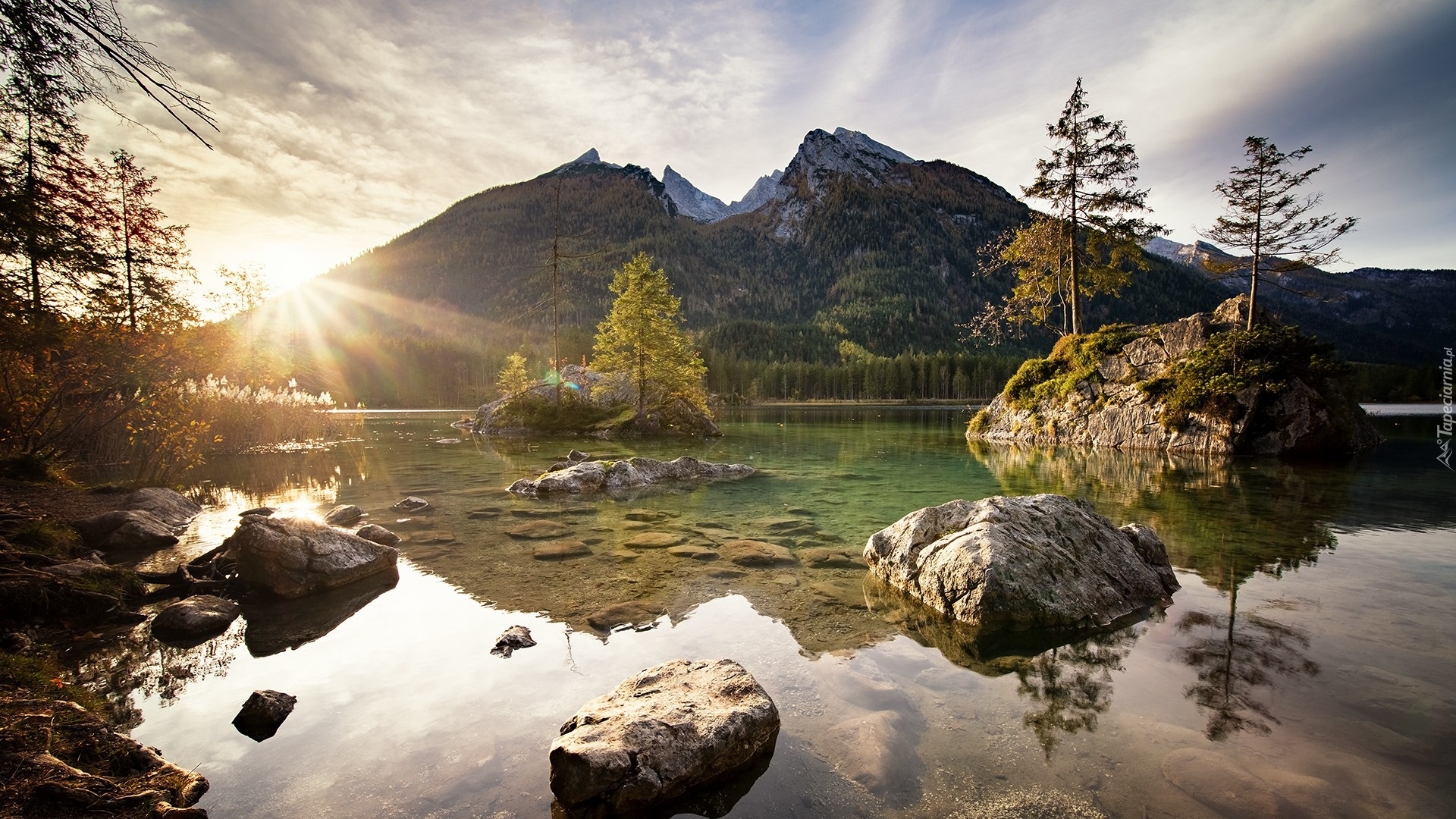 Edytor tapety: Rozświetlone drzewa na skałach w jeziorze Hintersee