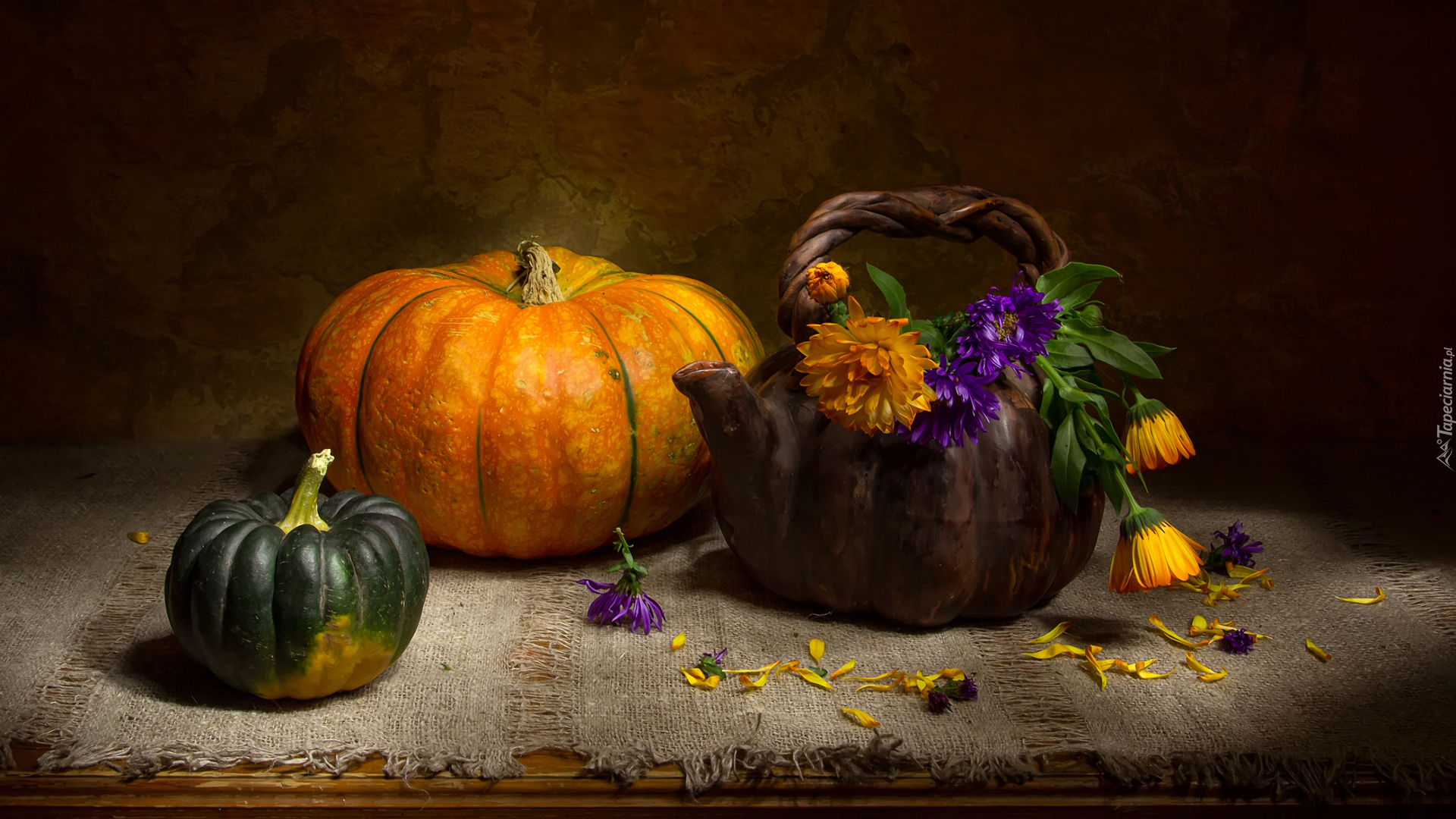 Edytor tapety: Dynie obok czajniczka z kwiatami