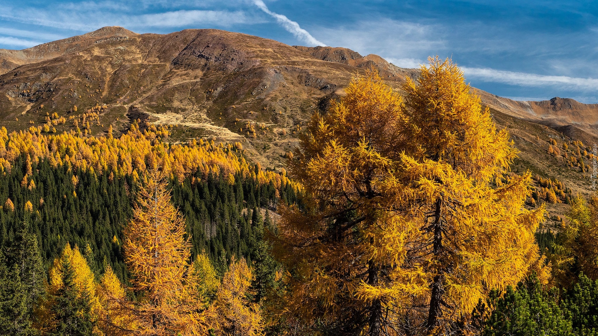 Edytor tapety: Pożółkłe drzewa i góry w tle