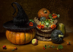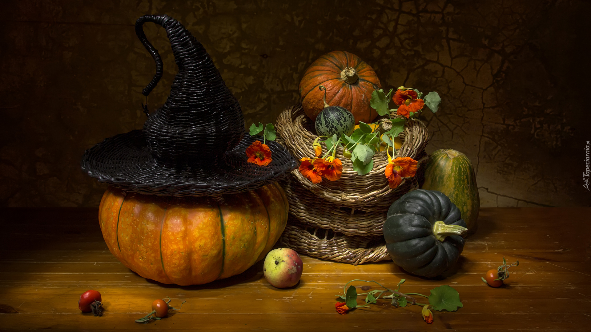 Edytor tapety: Dynie i kwiaty w koszyku w halloweenowej kompozycji