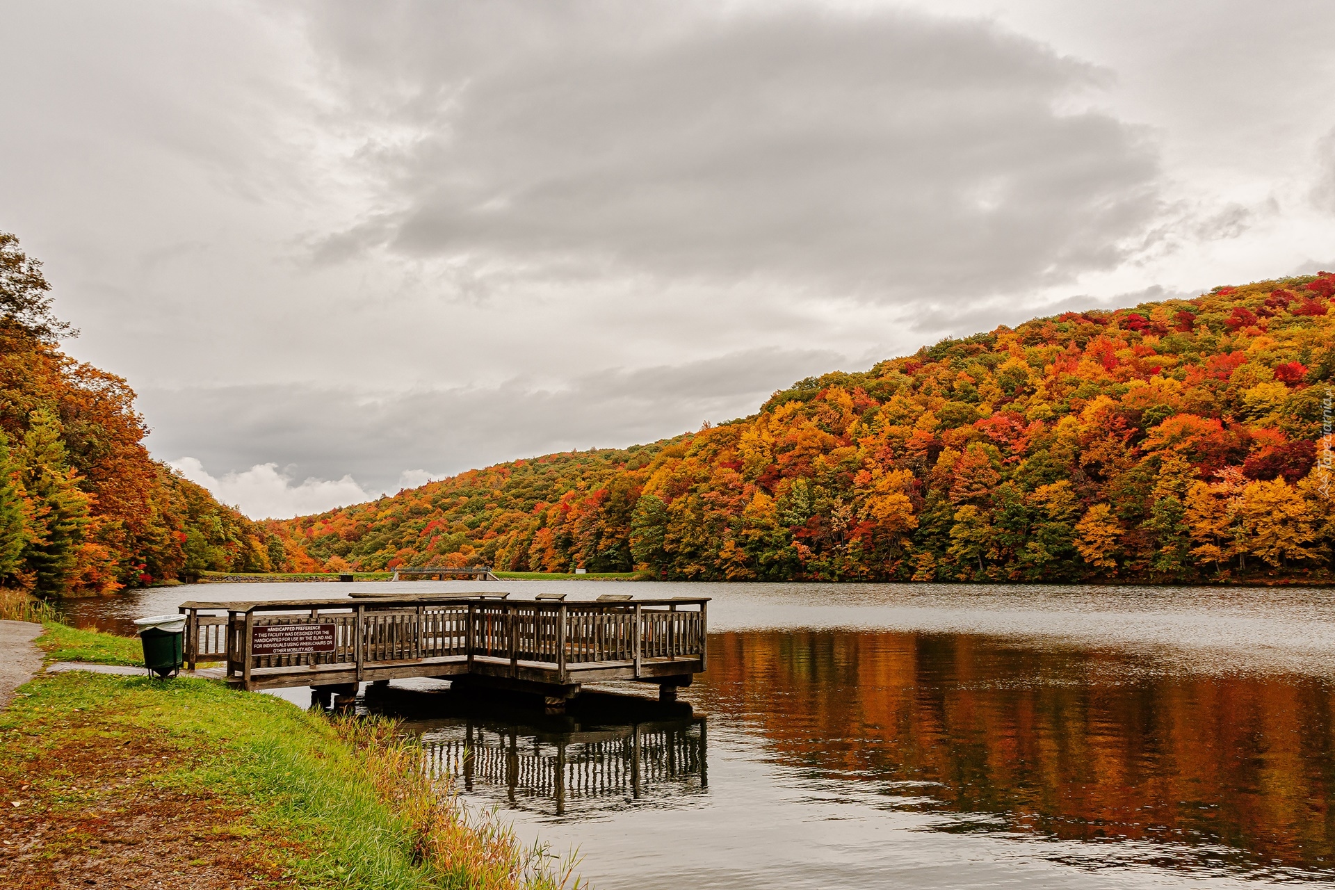 Edytor tapety: Pomost na jeziorze otoczonym jesiennymi drzewami