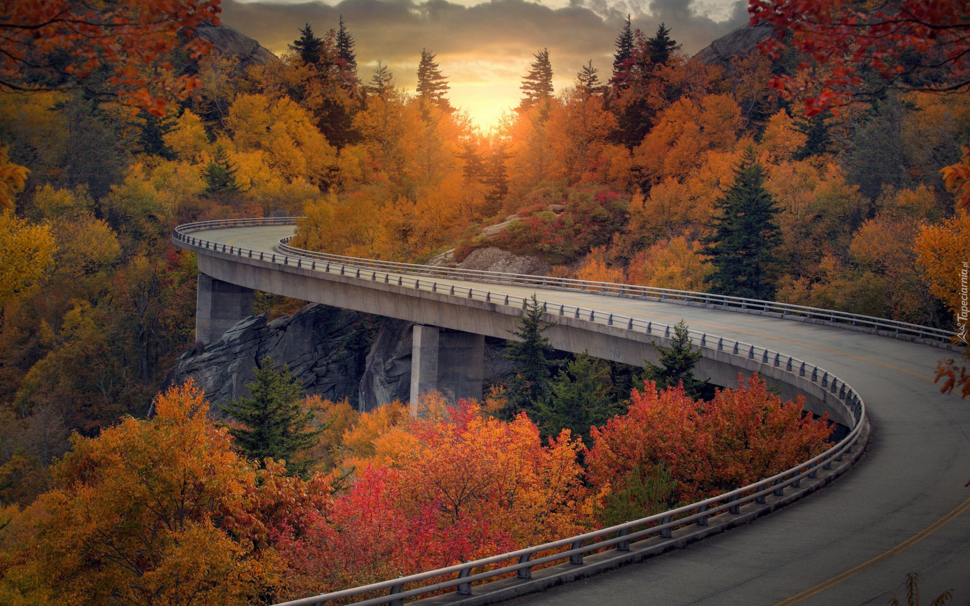 Edytor tapety: Jesienne drzewa przy zakręcie drogi na wiadukcie