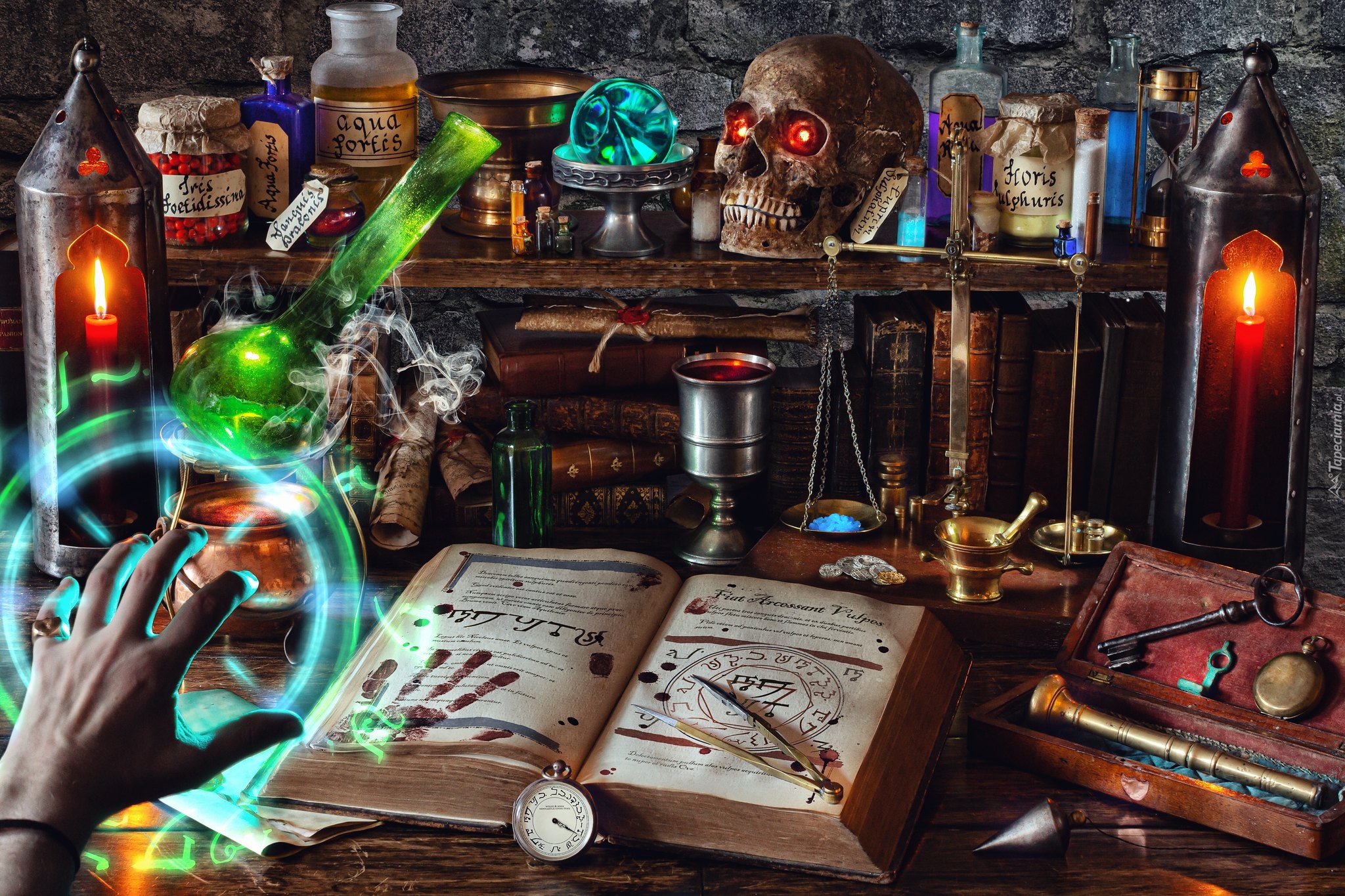 Edytor tapety: Czaszka i księga w kompozycji na Halloween