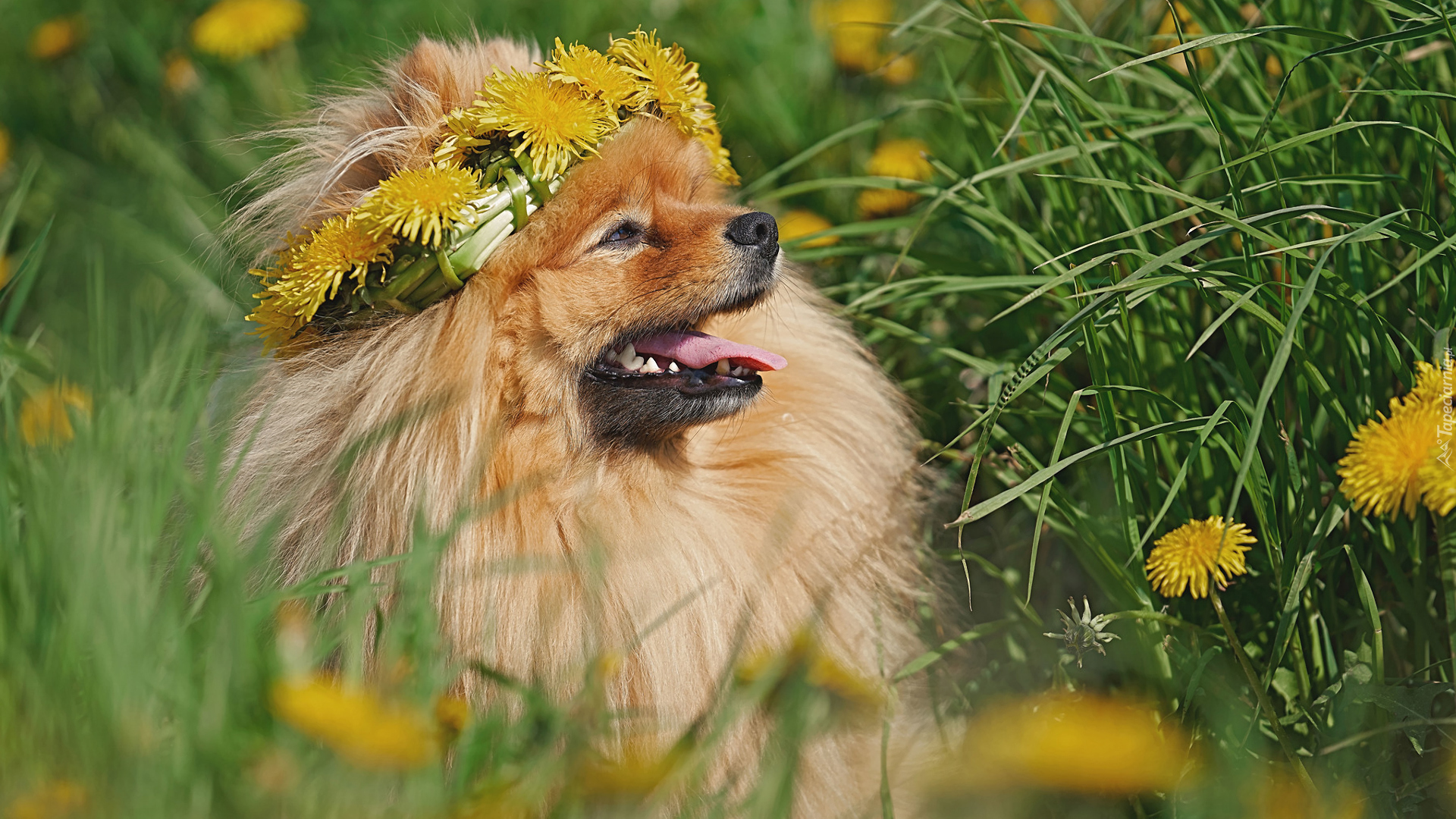 Edytor tapety: Szpic miniaturowy w wianku z mleczy na głowie