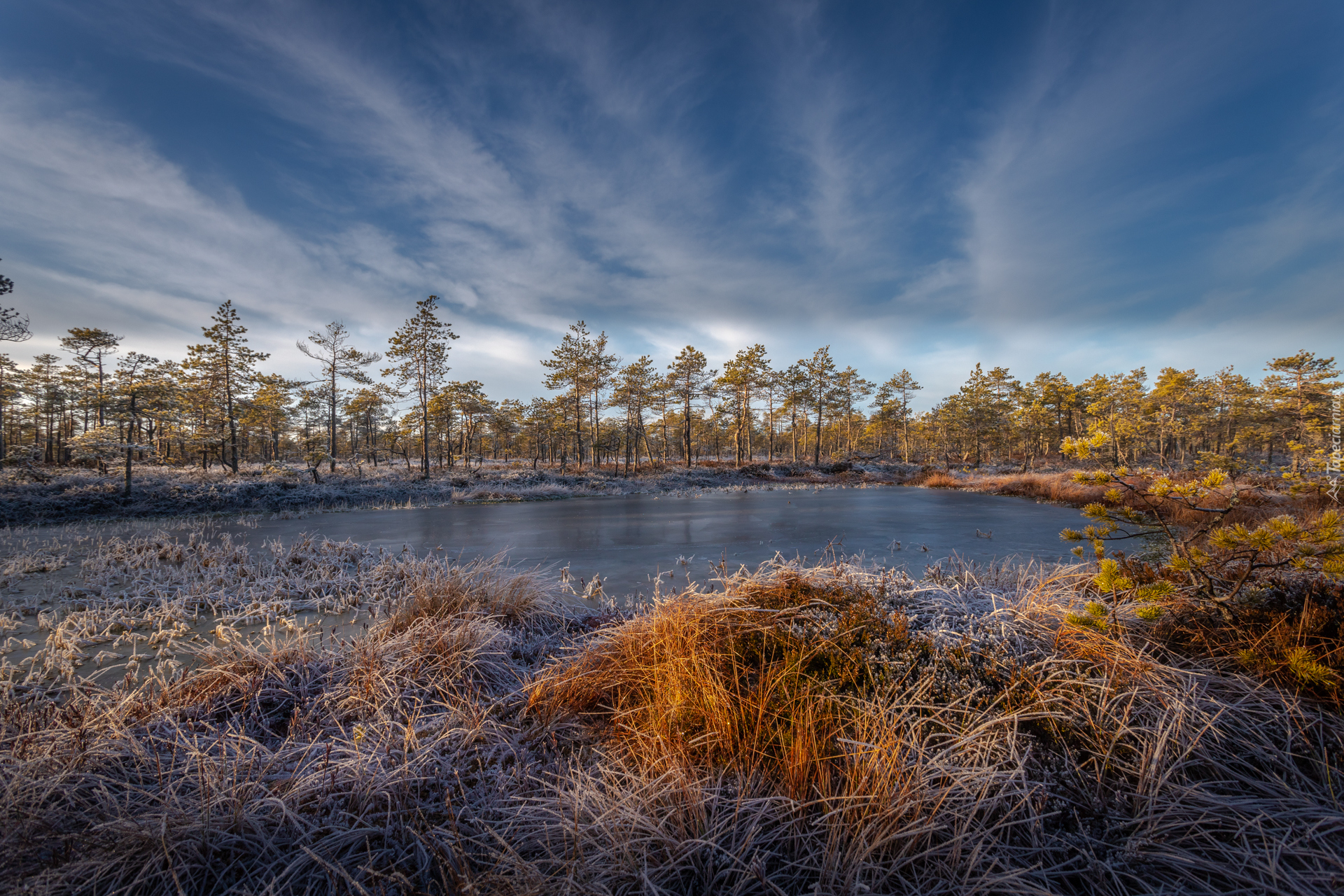 Edytor tapety: Oszronione trawy i drzewa na bagnach