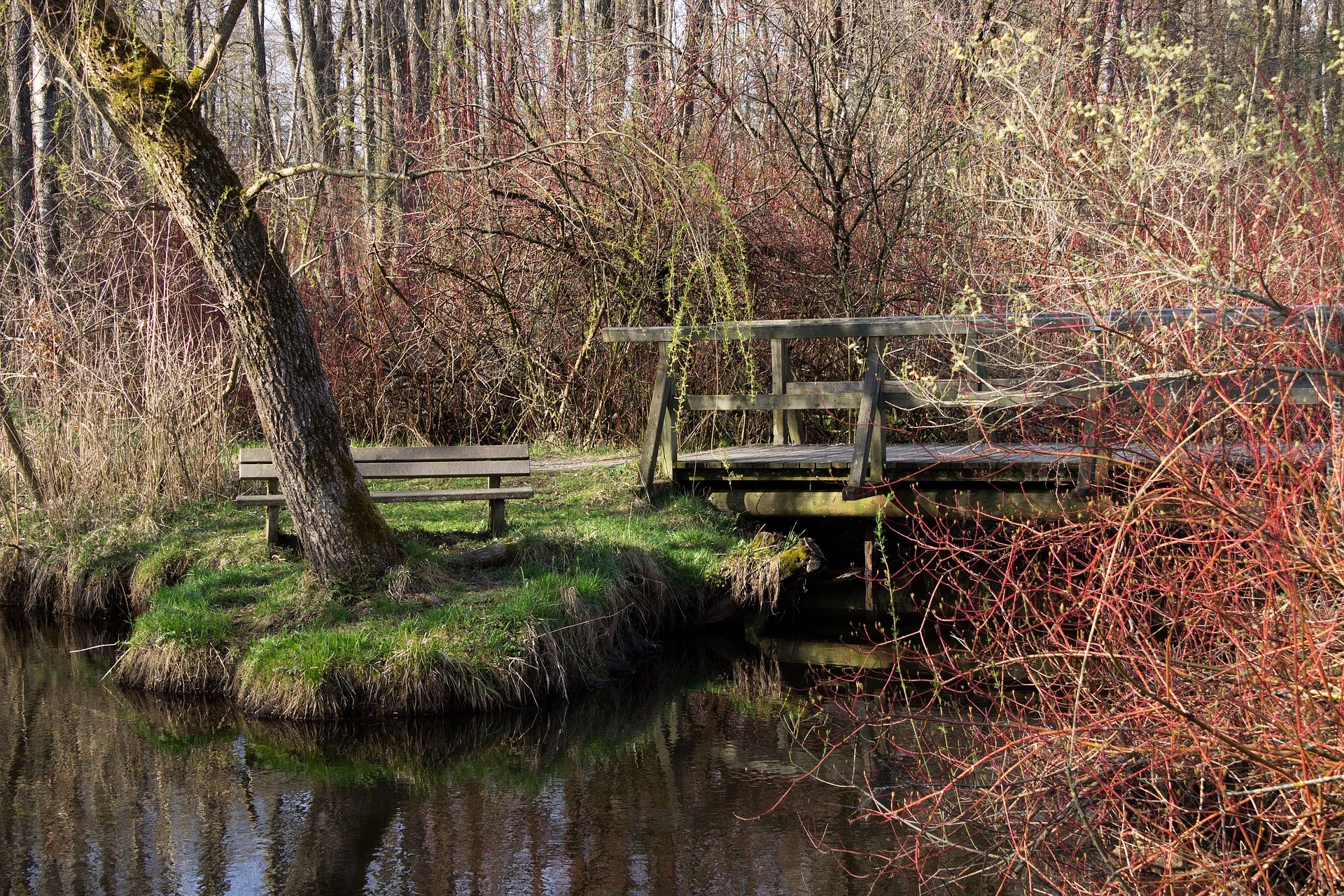Edytor tapety: Ławka i mostek wśród krzewów nad stawem