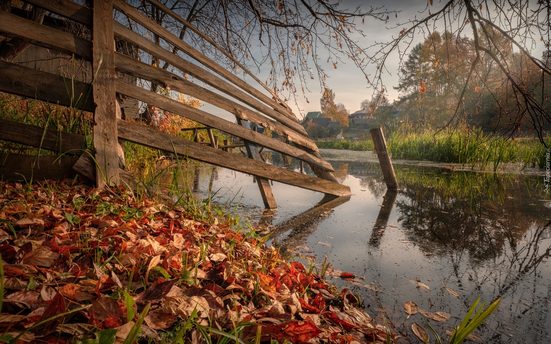 Edytor tapety: Opadłe liście przy ogrodzeniu nad stawem