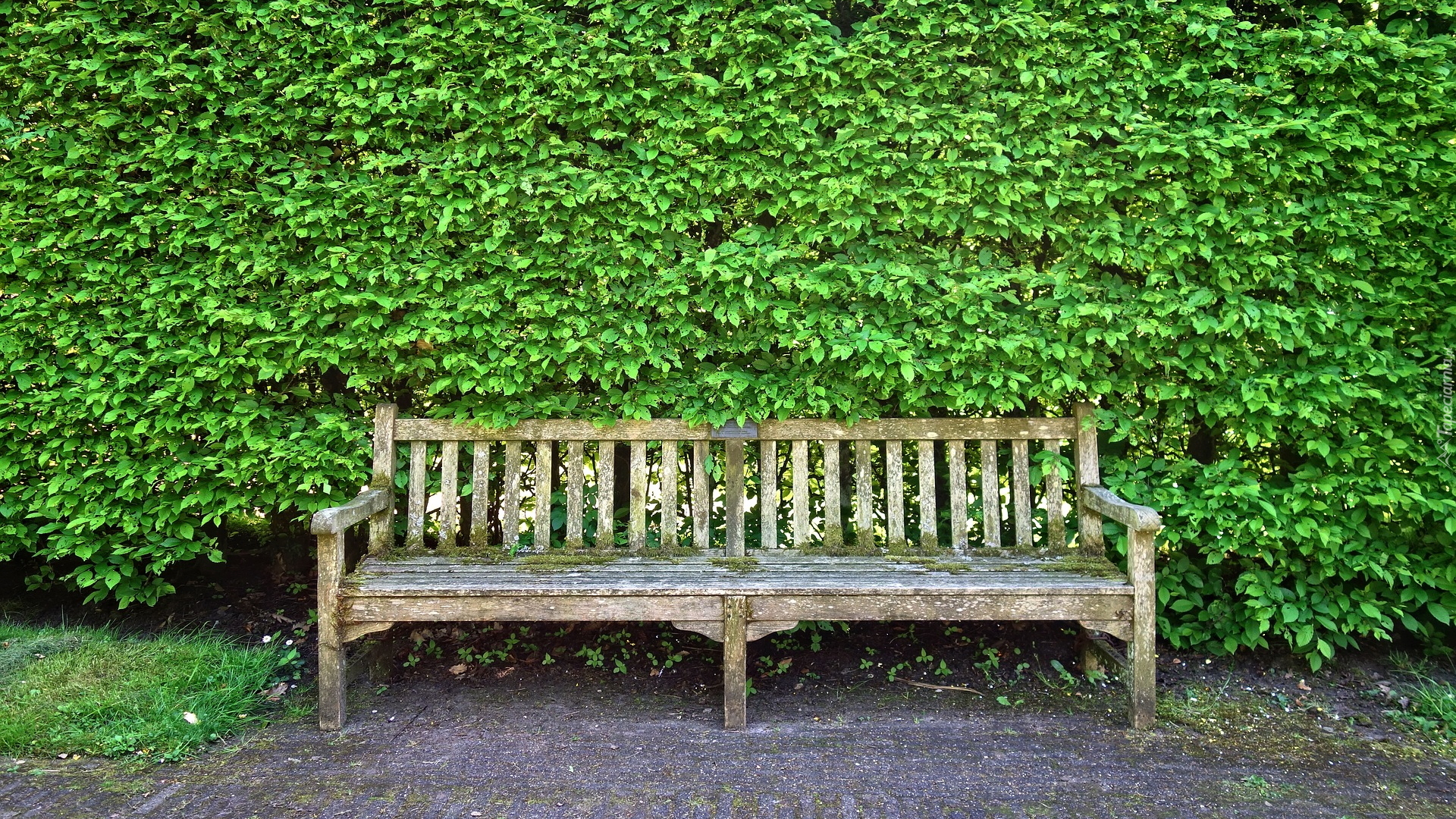 Edytor tapety: Ławka przy zielonym krzewie