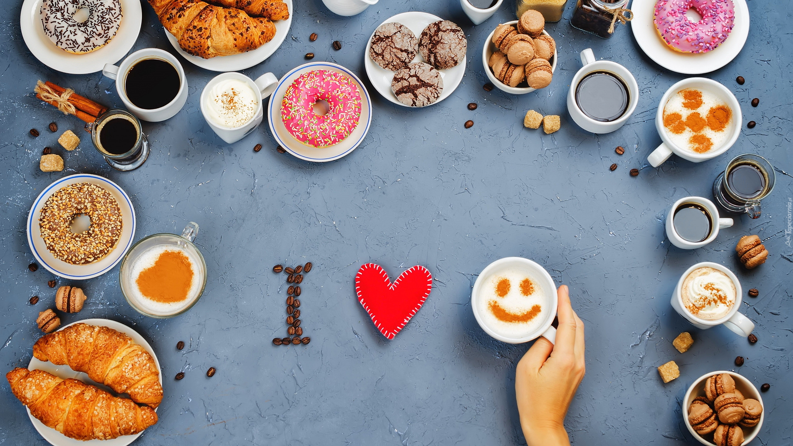 Edytor tapety: Kubek kawy w dłoni pośród pączków i ciasteczek