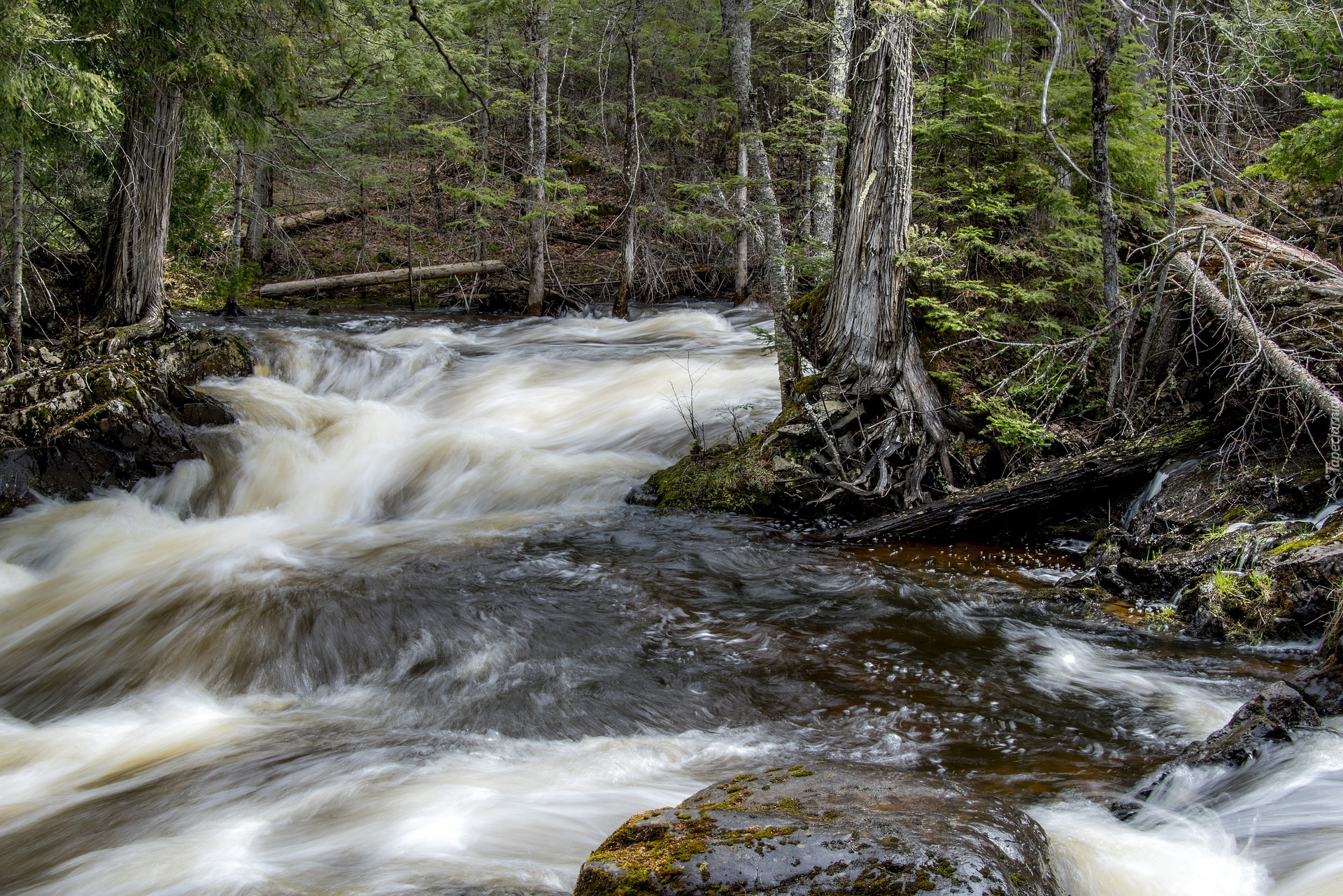 Edytor tapety: Połamane drzewa przy rwącej leśnej rzece