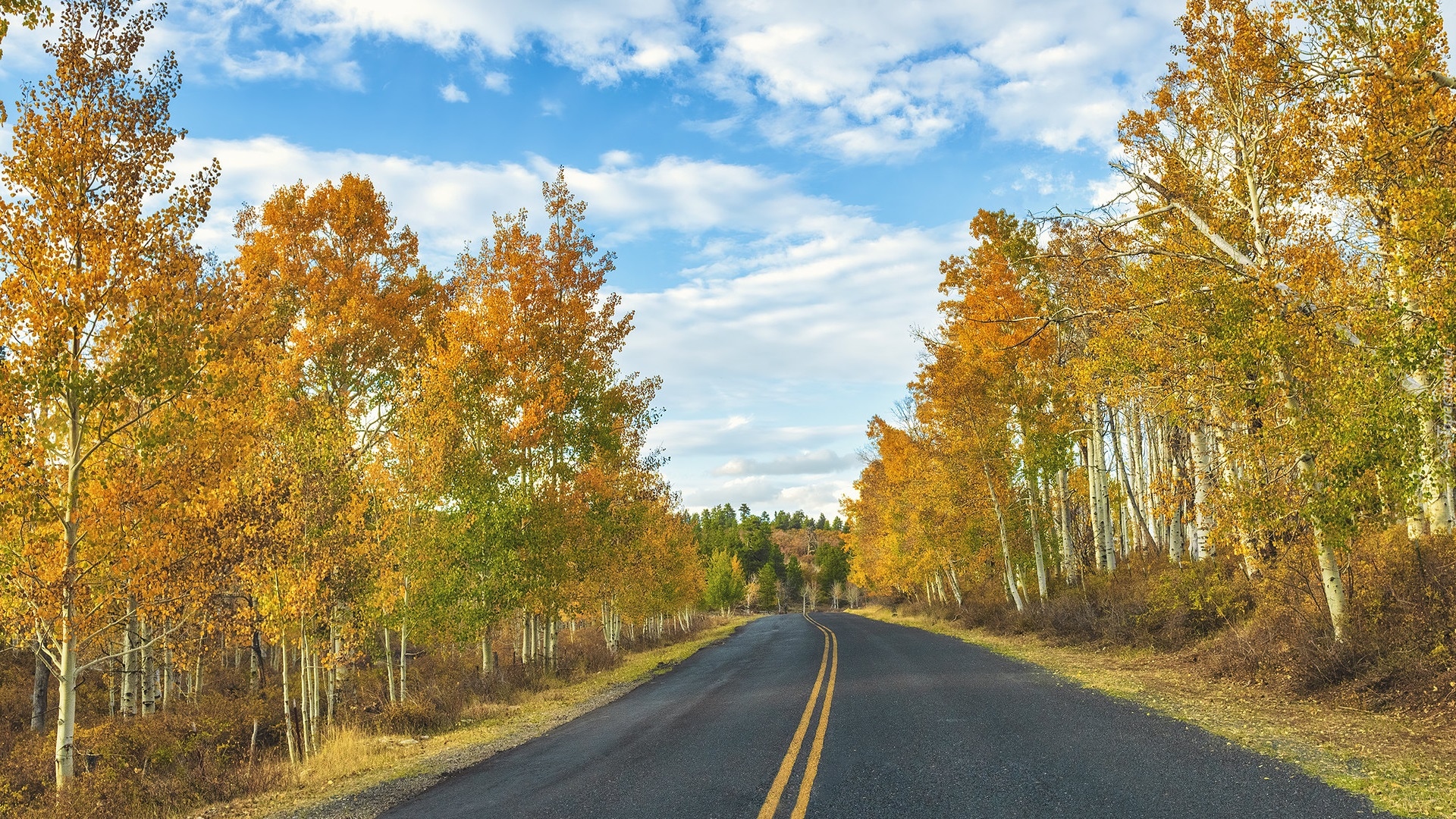 Edytor tapety: Jesienne brzozy po obu stronach asfaltowej drogi